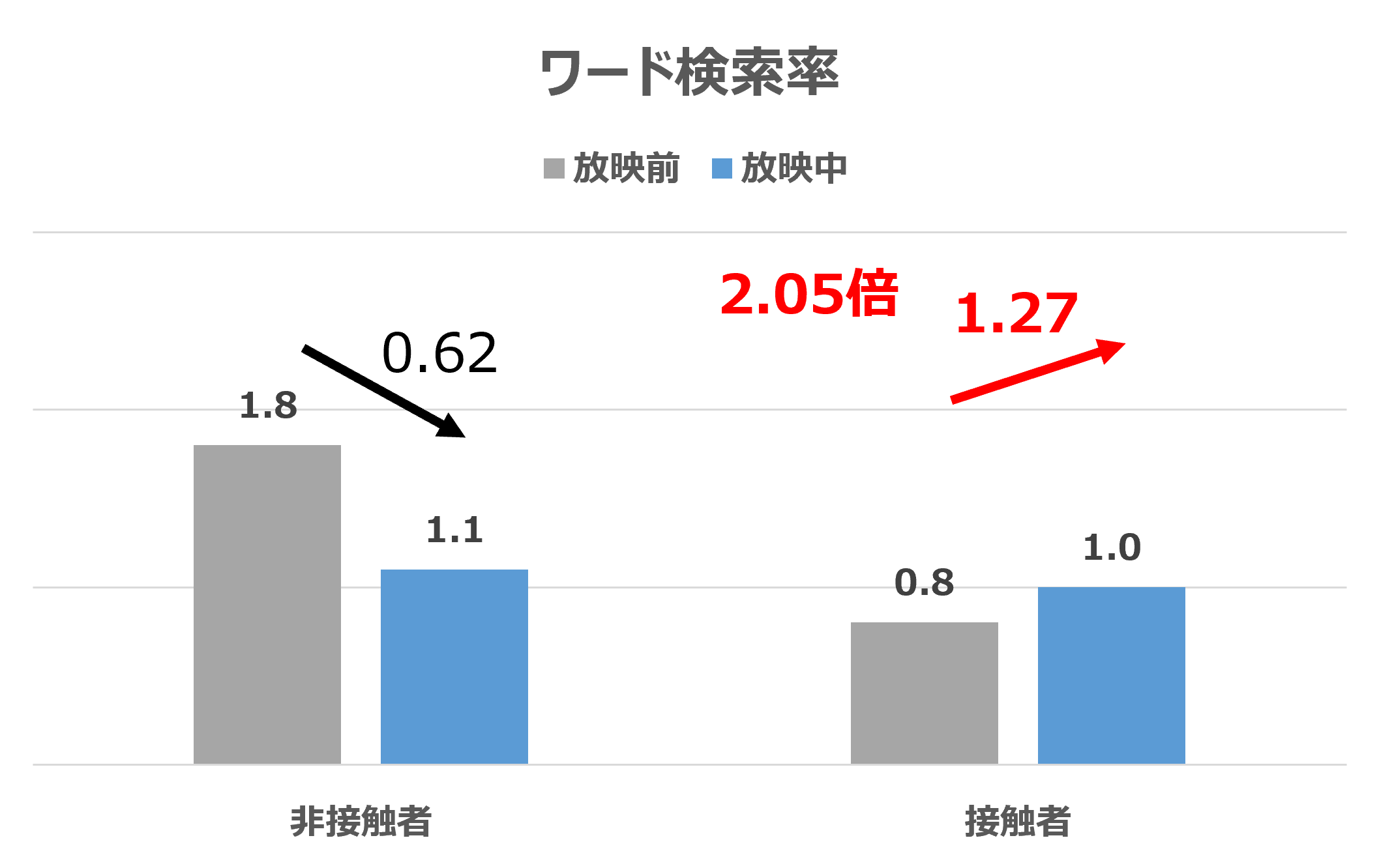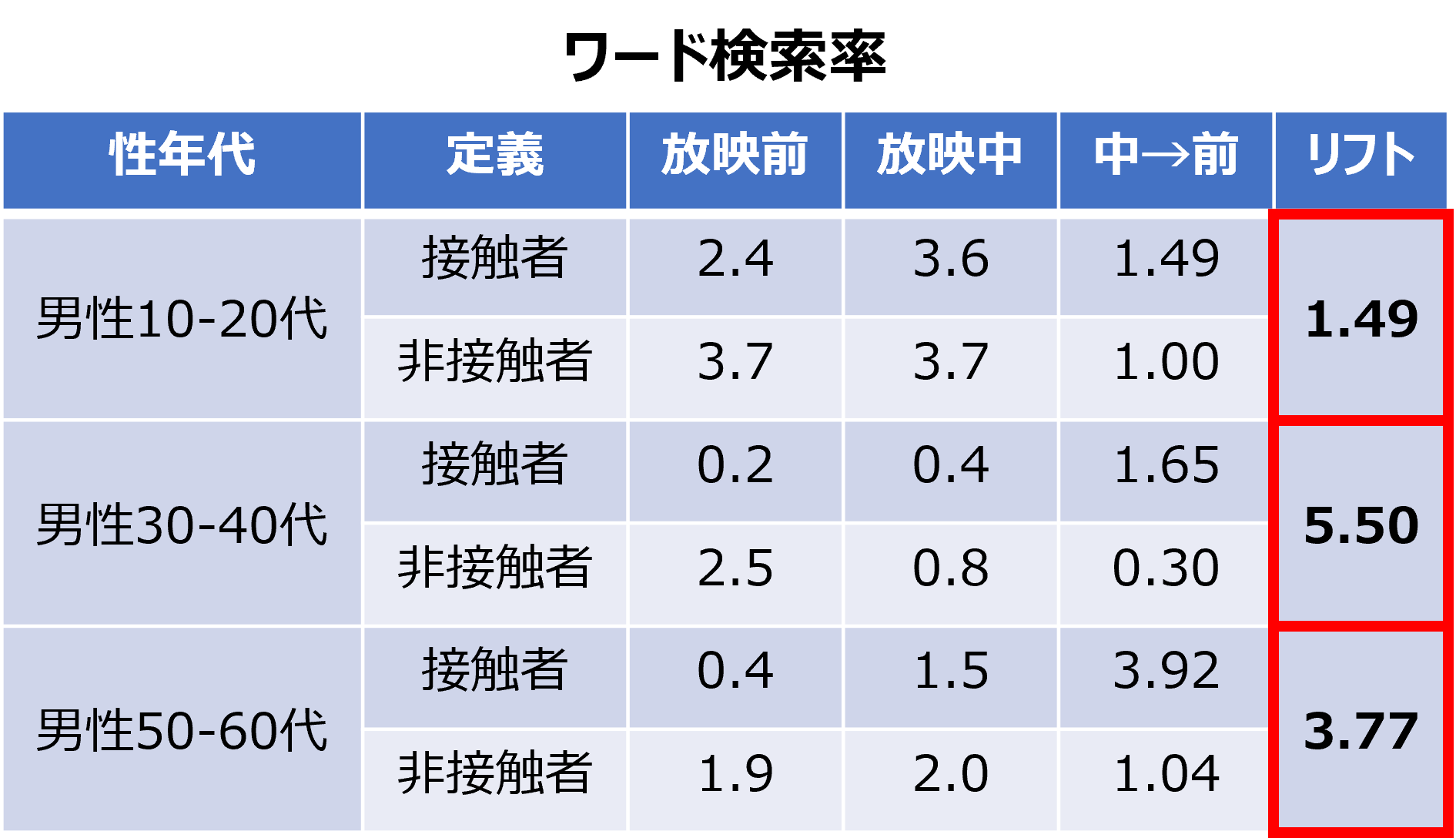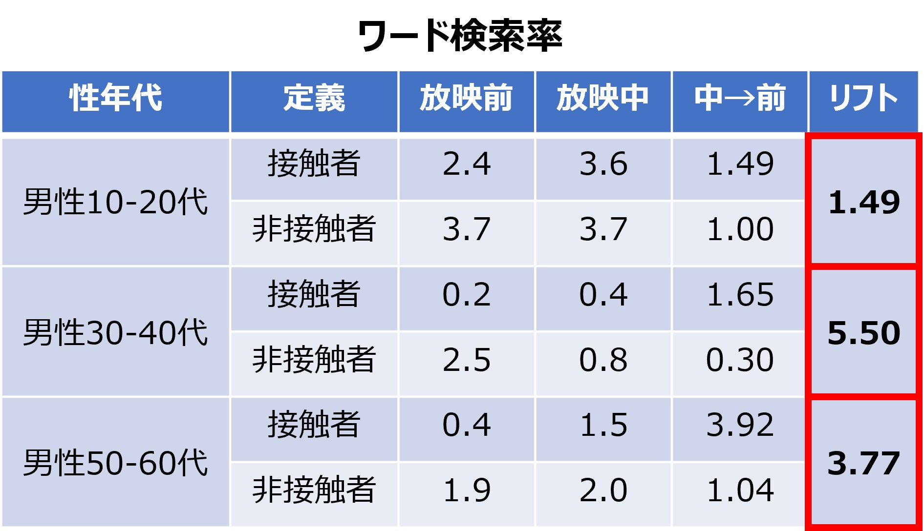 男性で検索行動が顕著だった点においては、放映商材の性質から興味・関心が比較的男性で高いと推測でき、広告接触によりさらに興味・関心を高めることに繋がったと考えられます。