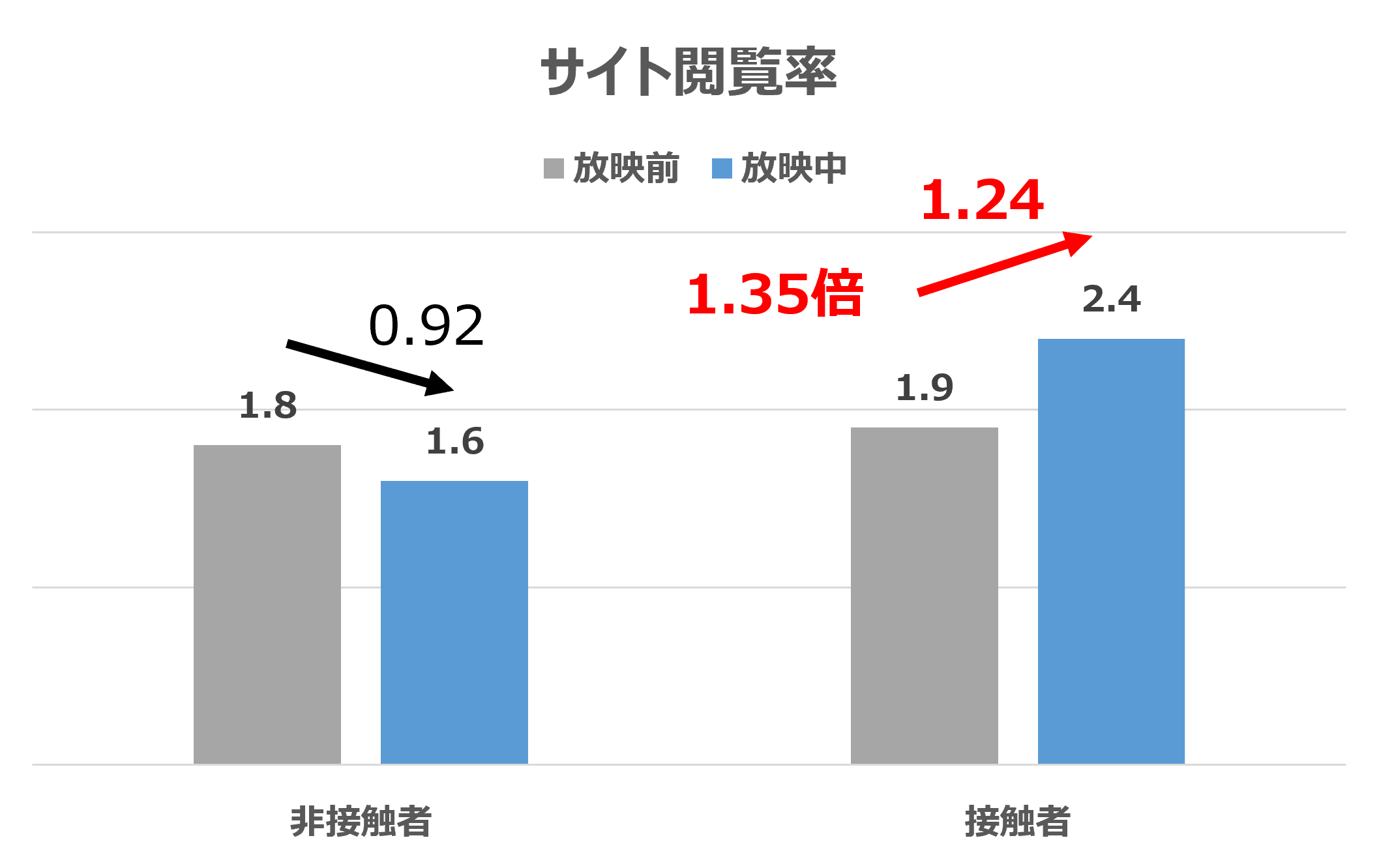 今回の調査結果からFamilyMartVisionの広告接触者/非接触者に関わらず、FamilyMartVision放映前から検索行動が生じていることから、一定程度の興味・関心はあったと推測します。その前提で、FamilyMartVision広告接触者は、放映前と比べて放映中の放映商材関連のワード検索率、サイト閲覧率ともに上昇しています。広告非接触は、放映前から中にかけてスコアが下がっており、接触者と非接触者のリフト差はワード検索率で2.05倍と高く、サイト閲覧率でも1.35倍になっており、検索行動への高い効果が確認できました。FamilyMartVisionの広告接触が商材の興味・関心を高め、放映前よりもさらなる検索行動に繋がったと考えられます。またワード検索/サイト閲覧も共にリフトしていることから、検索行動が単なるワード検索だけに留まらず、サイト閲覧までの一連のWeb上の行動を引き起こしたとも様子も窺えます。