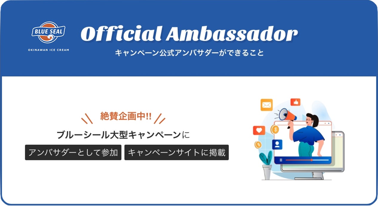 フォーモストブルーシール株式会社が運営する「ブルーシール(BLUE SEAL)」のキャンペーン公式アンバサダーを募集する共同プロジェクトです。ブルーシールが好き、沖縄が好き、アイスが好きなどの方のご応募が多数ありました。