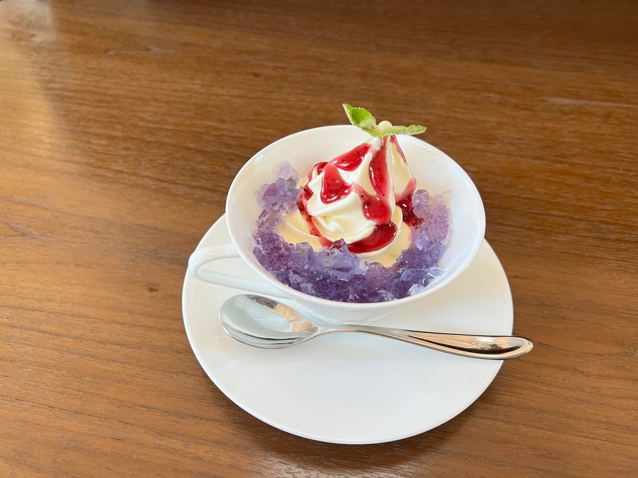 あじさいをイメージした青や紫色のゼリーとふわふわとしたなめらかな食感が自慢のカルピジャーニソフトクリームをあわせた、自慢のソフトクリームのサンデー