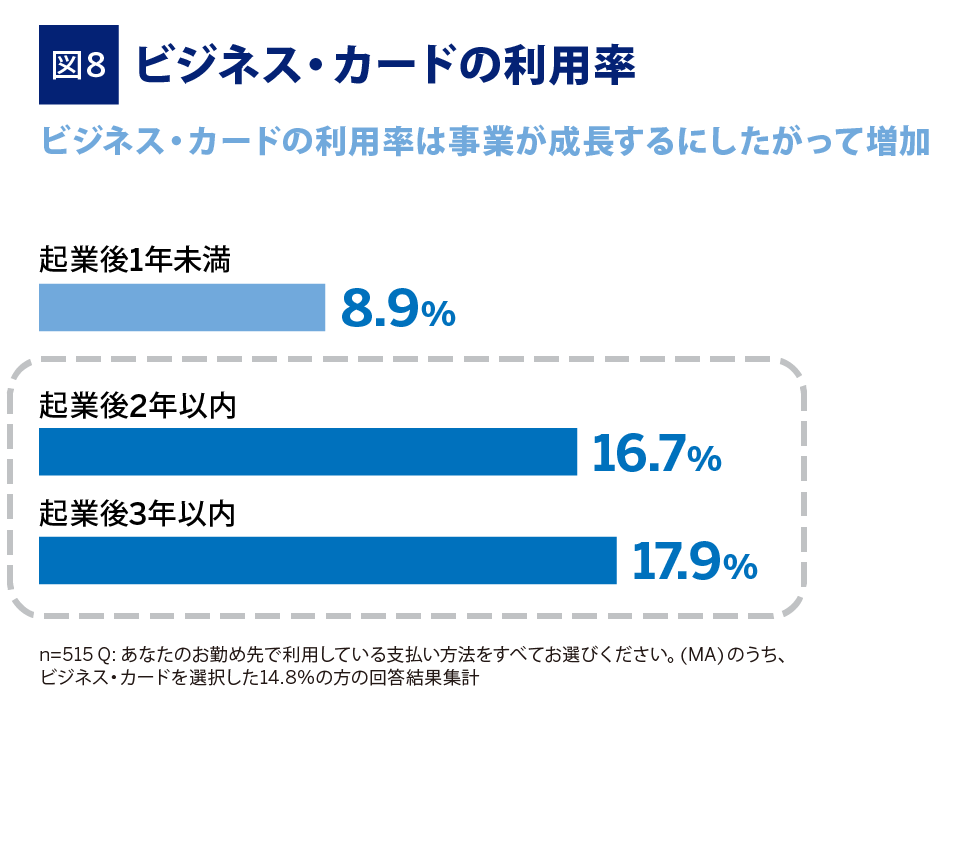 ビジネス・カードの利用率は創業1年未満で8.9%、2年目では16.7%、3年目で17.9%と増加します(図8)。ビジネス・カードは、創業直後では利用場面が限定的であるものの、事業を展開していくにあたって取引先が拡大することなどから、利用する場面も増加することがうかがえます。