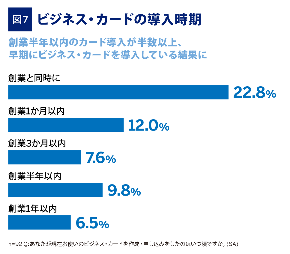 ビジネス・カードを導入している企業は創業と同時(22.8%)に導入していることが最も多く、さらに創業6か月以内の導入が半数以上に達しています(図7)。