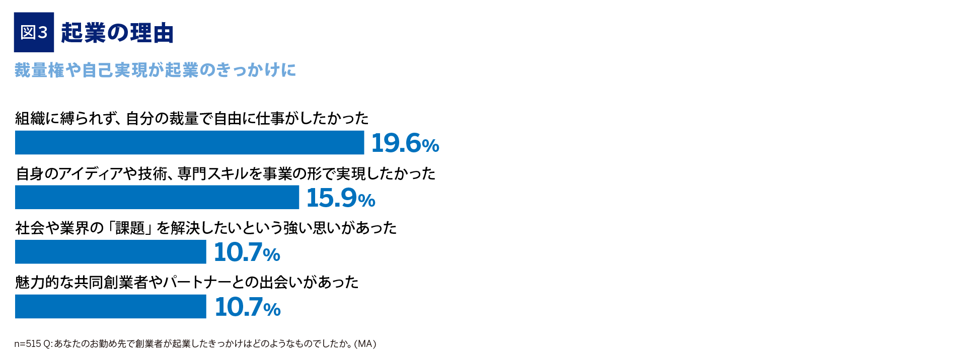 起業の理由として、「組織に縛られず、自分の裁量で自由に仕事がしたかった (19.6%)」や「自分のアイディアや技術、専門スキルを事業の形で実現したかった (15.9%)」が多く挙げられ(図3)、給与や金銭面といった条件面でのメリットよりも、裁量権や自己実現への想いが寄せられる結果となりました。社会的な後押しを受け、理想とするキャリアの実現に挑戦する経営者像が浮き彫りとなりました。
