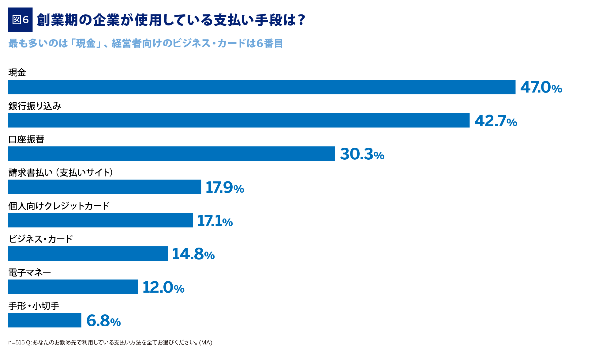 使用している支払い方法で最も多いのは現金(47.0%)、次いで銀行振込(42.7%)が挙げられ、経営者向けのビジネス・カードは14.8%と6番手となりました(図6)。法人口座の開設に時間がかかることもあることから、創業期においては現金が重視される傾向がうかがえます。