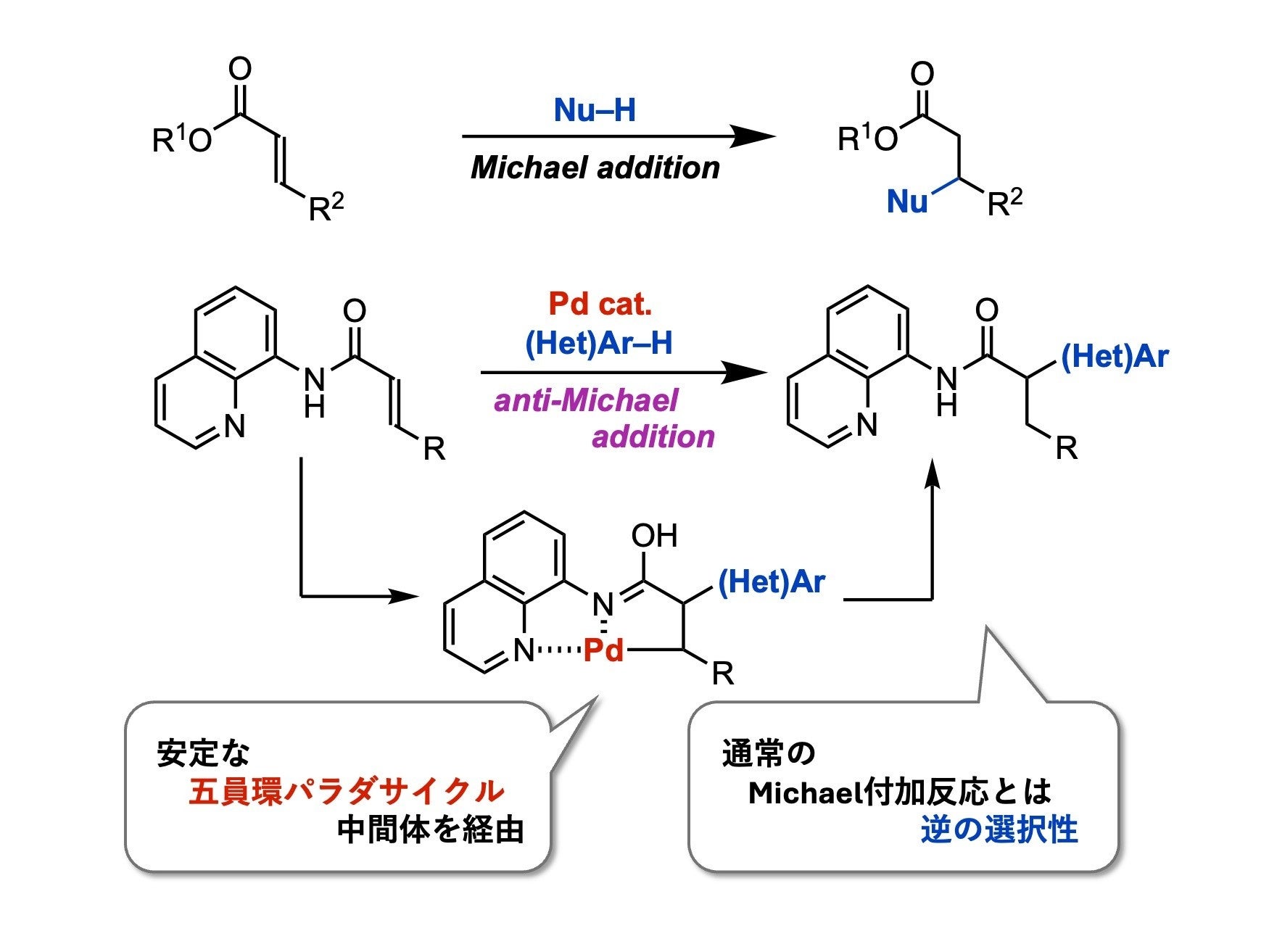 今回本研究グループはα,β-不飽和カルボニル化合物への配向基の導入による、五員環パラダサイクル形成(*4)を介した反応中間体の安定化により、anti-Michael型付加反応を実現できると考えました。