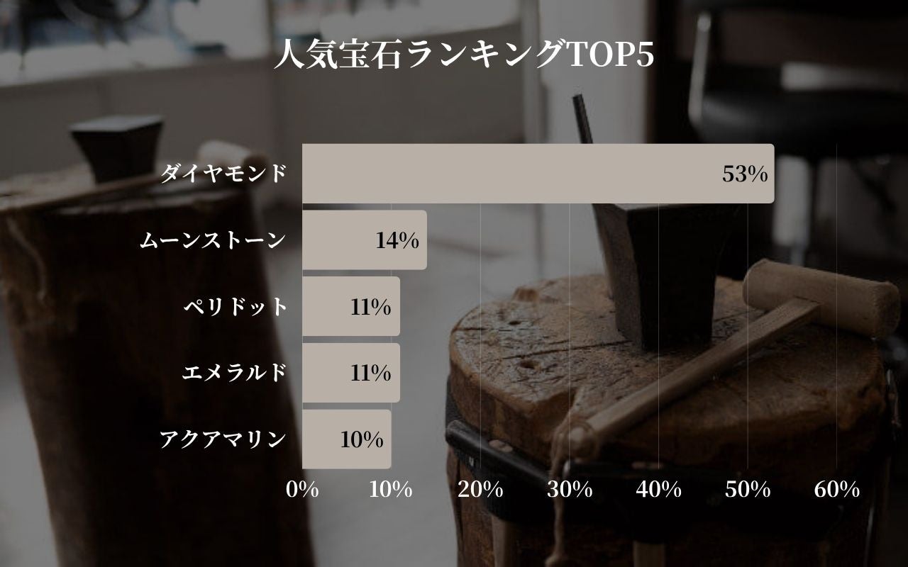 一方、ダイヤモンドに続く第2位以降は、ムーンストーン(14%)、ペリドット(11%)、エメラルド(11%)、アクアマリン(10%)と、僅差で様々なカラーストーンがランクインしました。これらの宝石は、それぞれ「誕生石」や「石言葉」が持つ意味合いから選ばれている傾向が強いと推察されます。