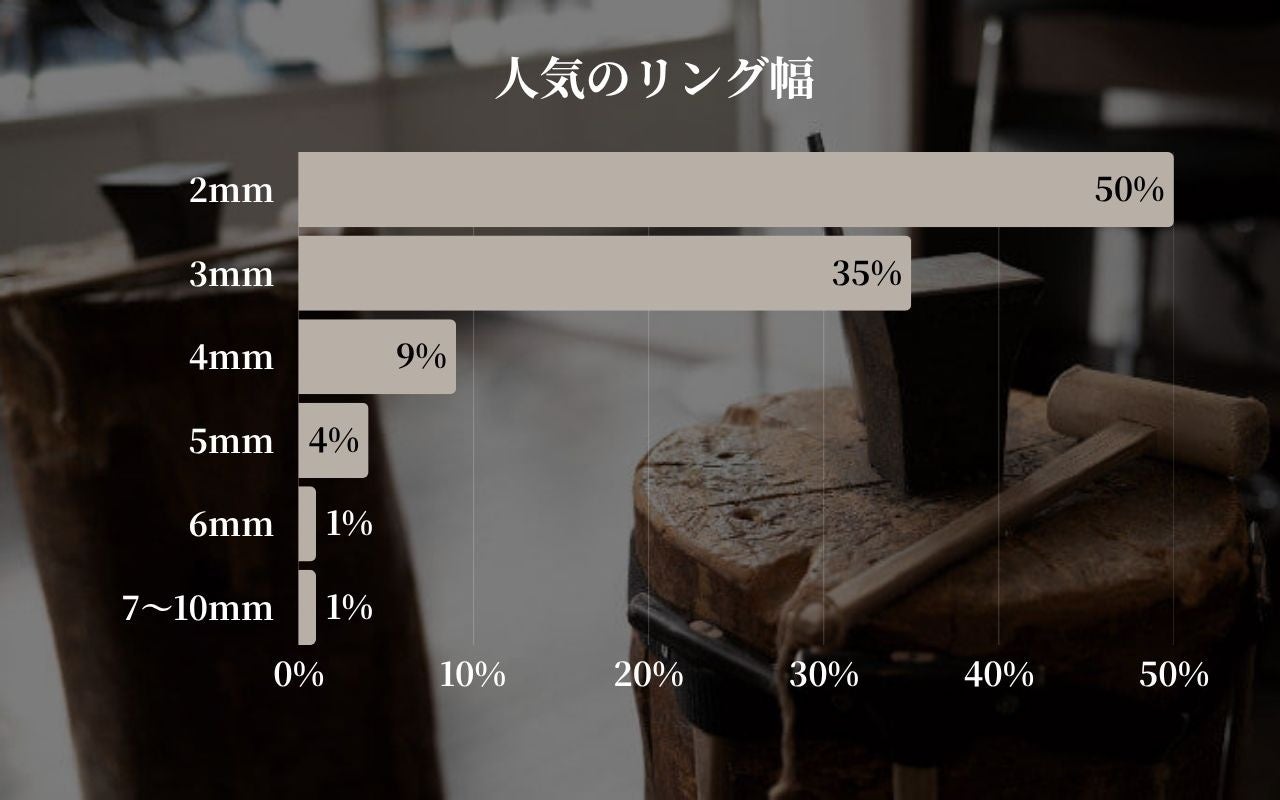 今月の人気リング幅の集計では、「2mm幅」が50%と半数を占め、圧倒的な人気となりました。これに「3mm幅」が35%と続き、2mm~3mmの細身のリング幅が全体の85%を占める結果となりました。