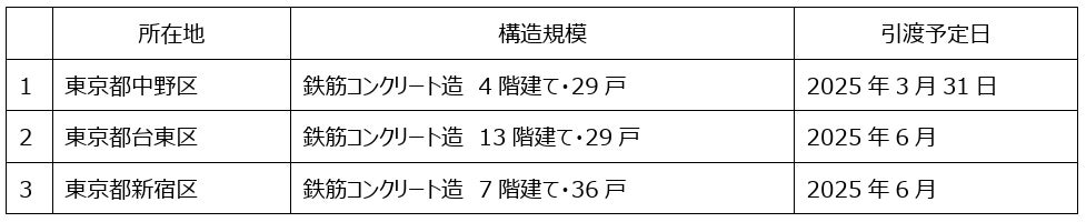 このたび、収益不動産を対象資産とする信託受益権を購入するための合同会社に対して、単独での匿名組合出資を行い、新たな収益の獲得を図ります。本日エクイティ投資を実行した 3 物件は、築浅かつ高品質でいずれも最寄り駅から徒歩 6 分圏内にあり、新宿をはじめとした主要なビジネスエリアへのアクセスが良好で利便性の高いレジデンスです。