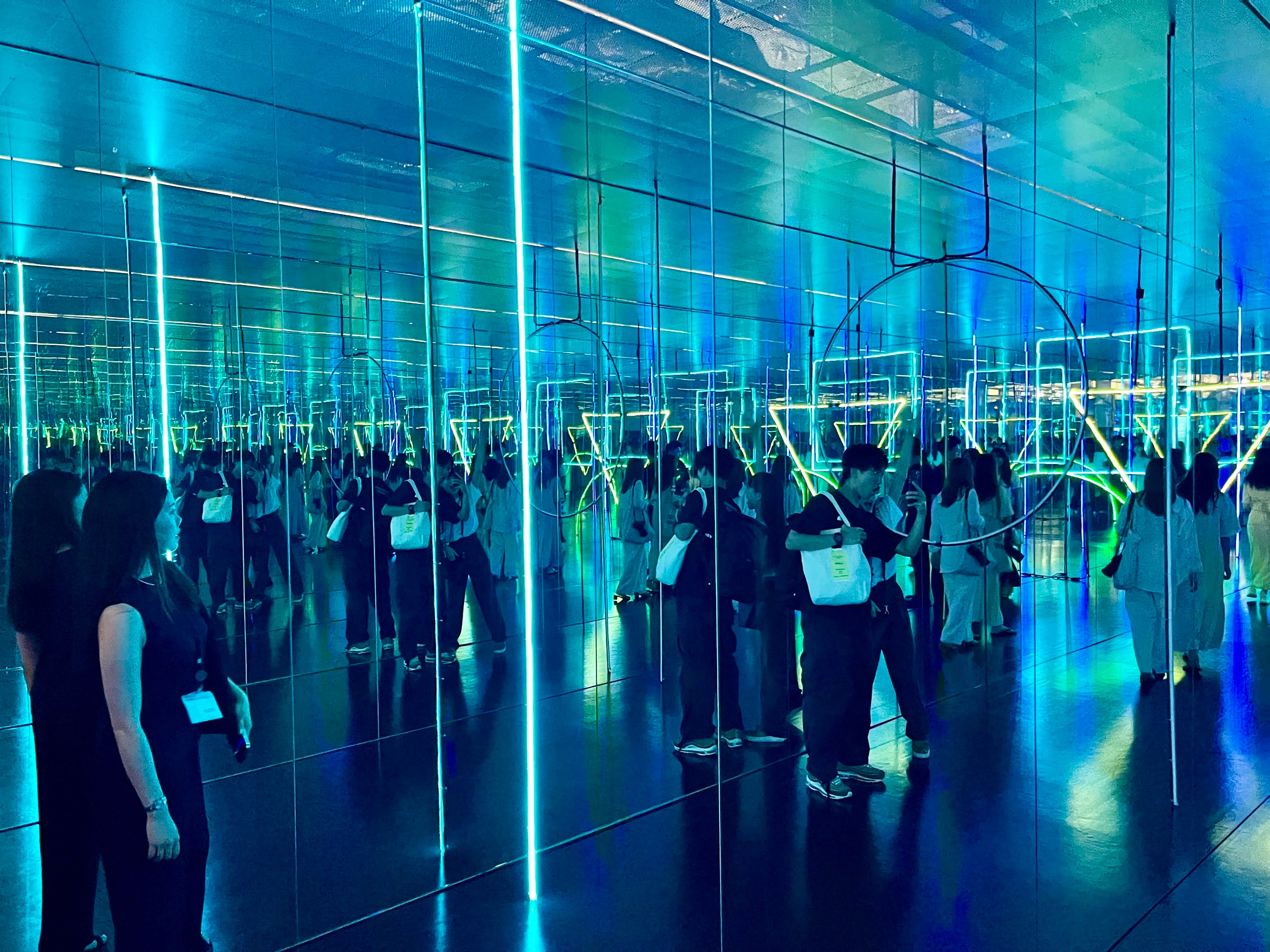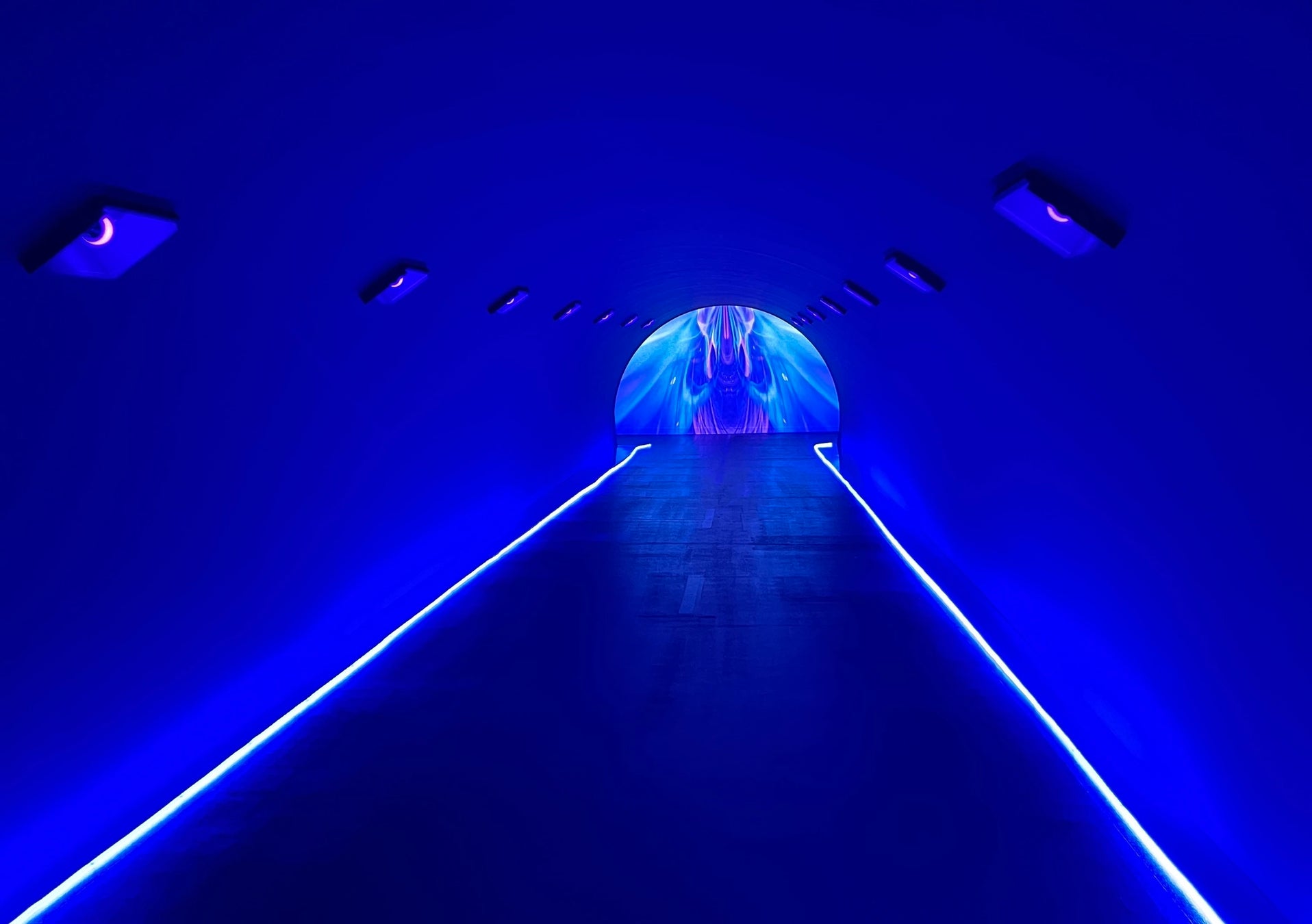 遠近法で体が大きく見える!?不思議なトンネル「∞(無限大)トンネル」をくぐり抜けると、ネオンとミラーが印象的な「かがみのこみち」が皆さまをお出迎え。独特な空間演出がワクワク感を誘います!