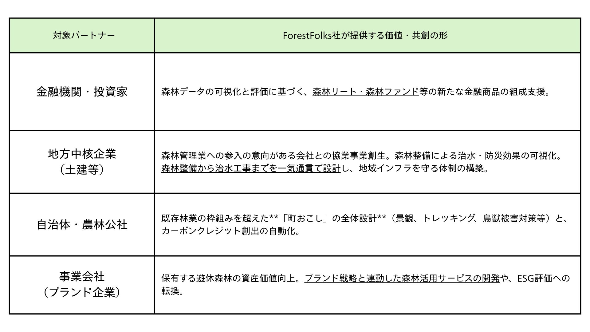 ForestFolks社では、今回の資金調達を機に金融機関・地方中核企業・自治体・農林公社等の森林に課題意識をお持ちの幅広いパートナーを募集しております。