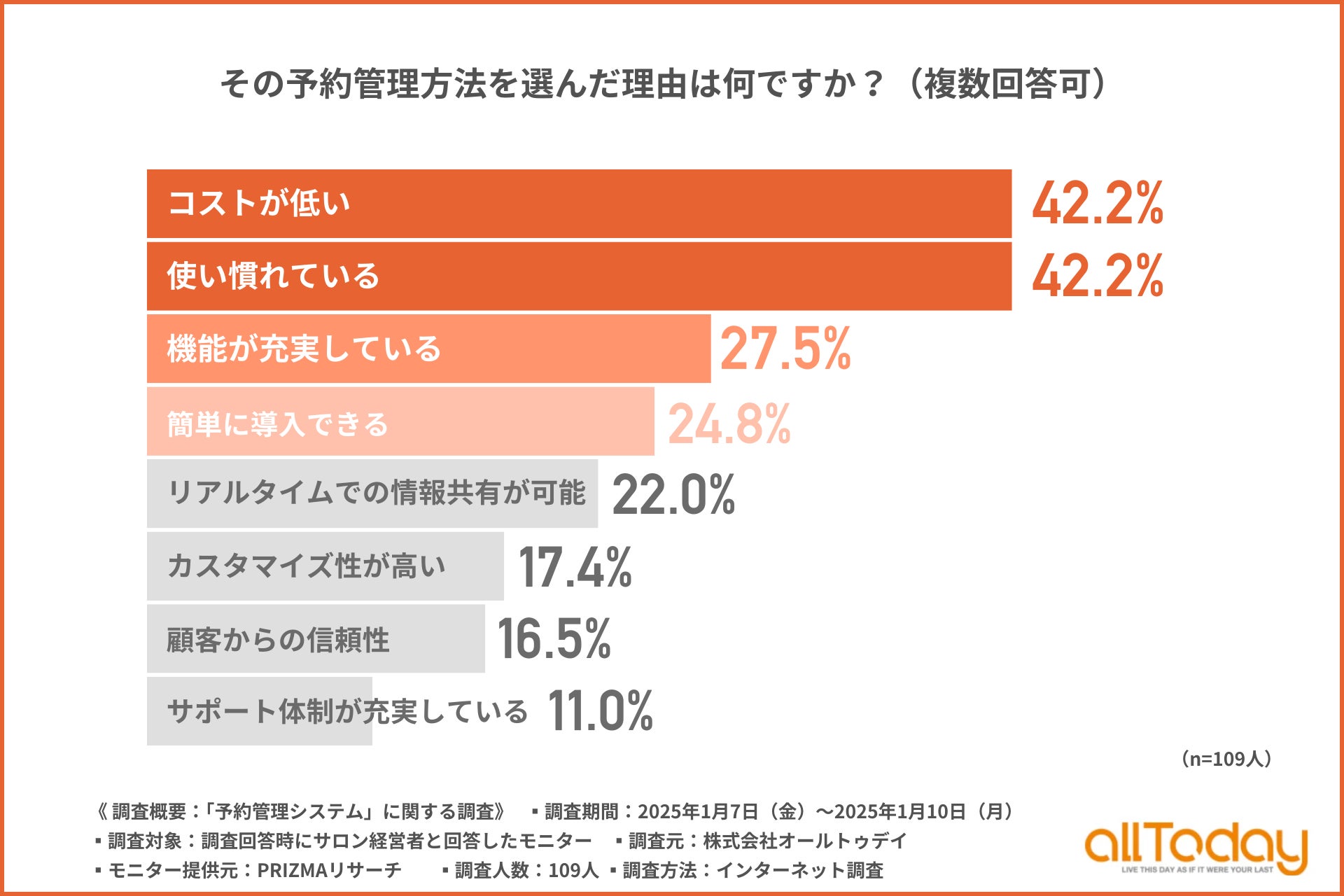 「その予約管理方法を選んだ理由」について尋ねたところ、『コストが低い(42.2%)』『使い慣れている(42.2%)』が同率で最も多く、『機能が充実している(27.5%)』『簡単に導入できる(24.8%)』となりました。