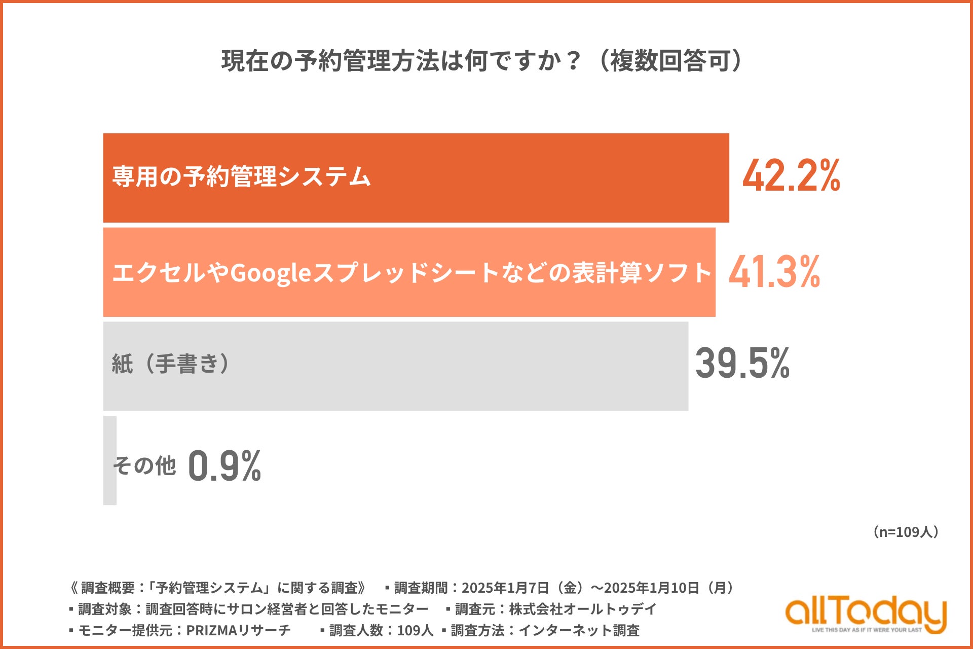 株式会社オールトゥデイ(本社所在地:埼玉県さいたま市)は、サロン経営者を対象に、「予約管理システム」に関する調査を実施しましたので、その結果を公表します。