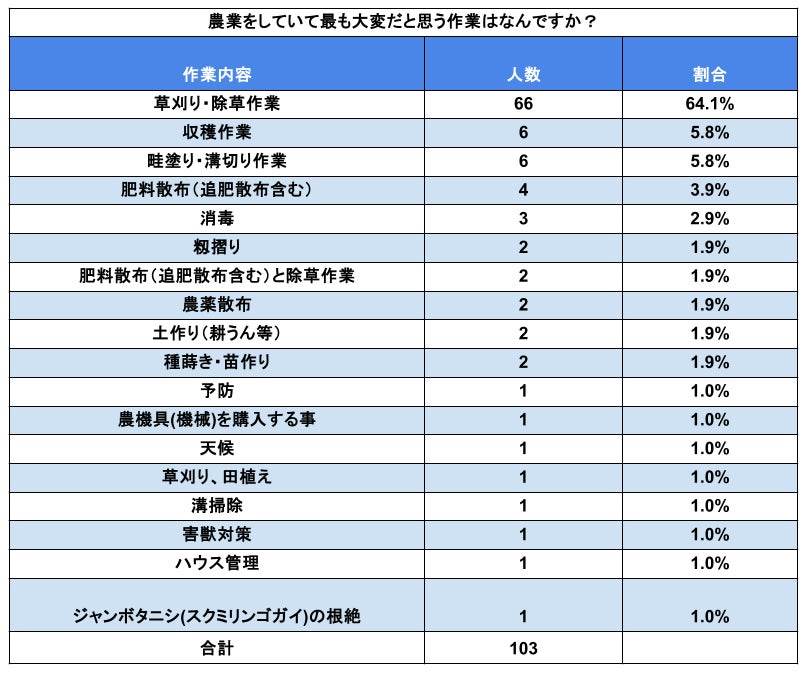 「農業をしていて最も大変だと思う作業はなんですか?」(n=103)と生産者様に質問したところ、「草刈り・除草作業」と回答した方が66名と全体の64.1%を占めました。次いで「収穫作業」と「畦塗り・溝切り作業」と回答した方が各6名(各5.8%)という結果となりました。