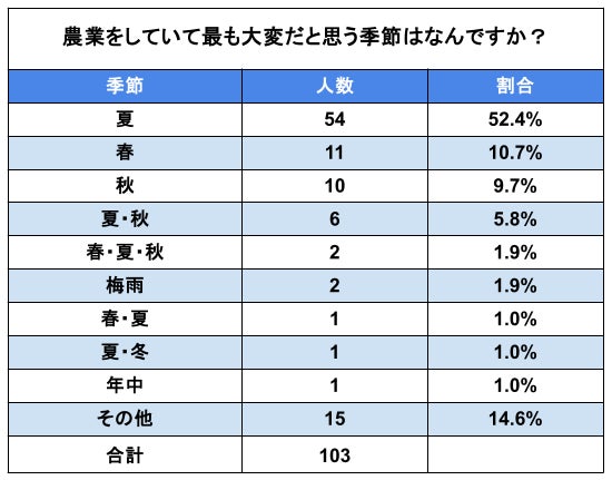 「農業をしていて最も大変だと思う時期はいつですか?」(n=103)と生産者様に質問したところ、「夏」という回答が最も多く54名(52.4%)、次いで「春」と回答した方が11名(10.7%)、「秋」と回答した方が10名(9.7%)という結果となりました。