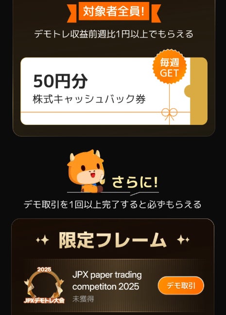 また期間中、デモトレード大会に参加された全ての方を対象に、週間収益が前週比で1円以上でも高ければ、50円のキャッシュバック券を毎週進呈(口座開設者のみ)いたします。