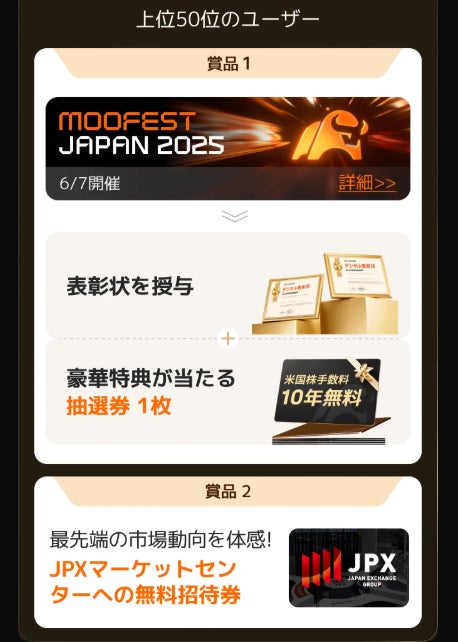 ■表彰&賞品:成績優秀者を表彰。上位ランキング者は、6月7日(土)moomoo証券主催の初の大型オフライン投資イベントのMooFest(ムーフェス、会場:東京都新宿区、詳細はこちら)で表彰いたします。
