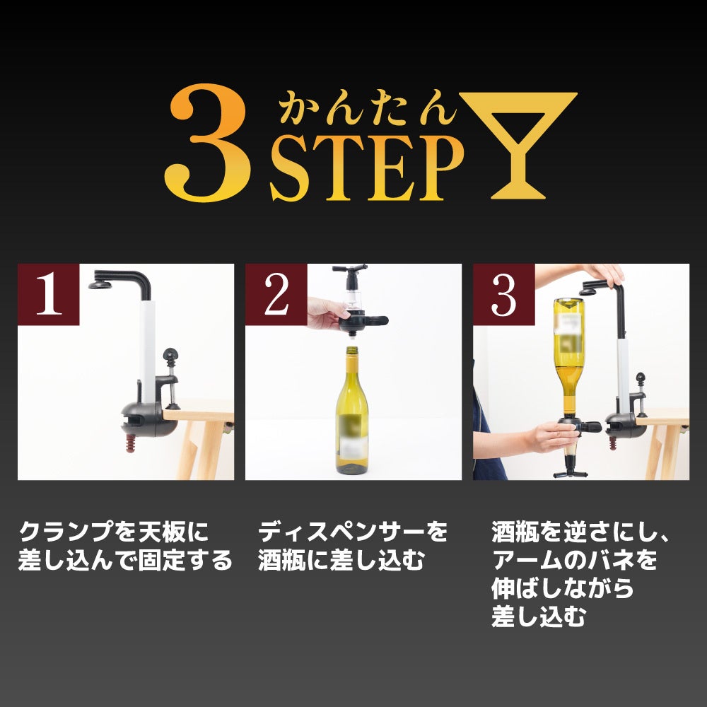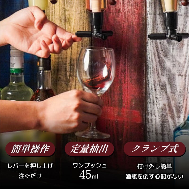 テーブルや棚板に本体のダイヤルを回して固定。お手持ちのお酒に付属のアタッチメントを取り付け、本体にセットすれば完了。ワインボトルやリキュールなど様々なボトルに対応。本体下部のレバーを上げると45ml分注がれます。追加したい場合はさらに繰り返せばお好みの量を入れることができます。