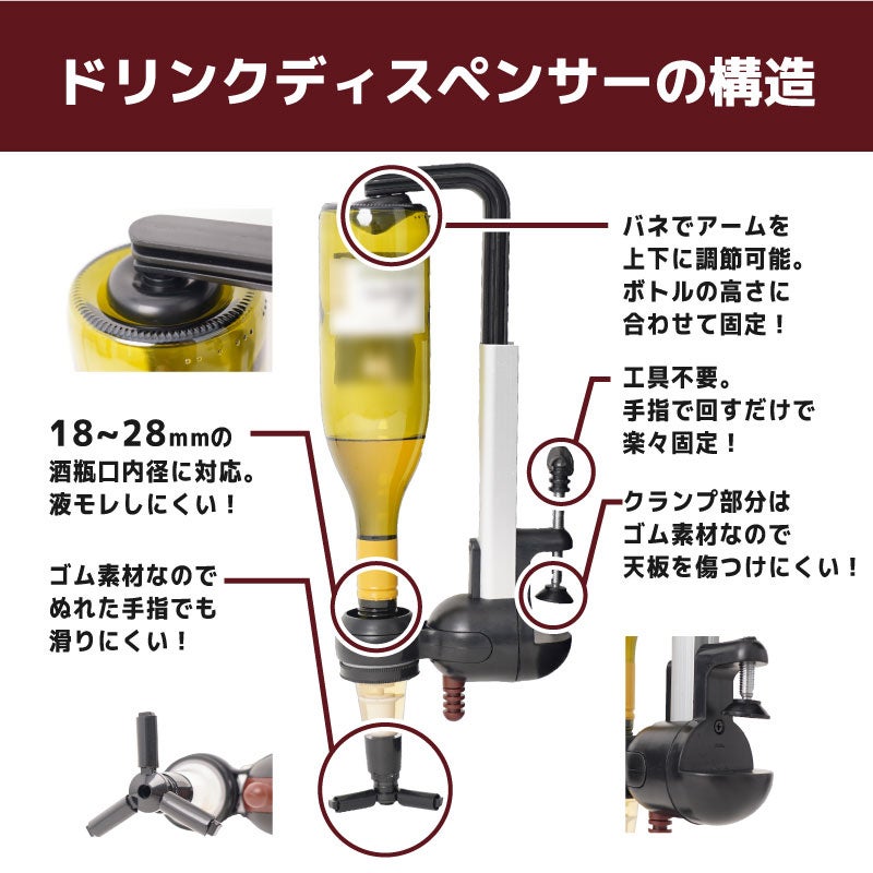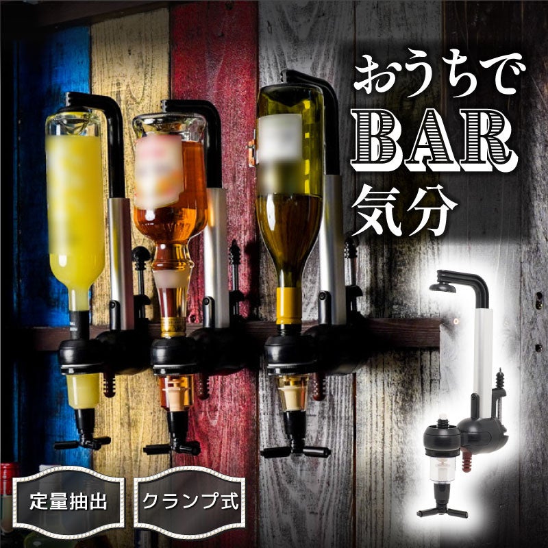 本製品は棚やテーブルなどお好きな所に取り付けてワンプッシュで45mlのお酒が注げるクランプ式ドリンクディスペンサーです。