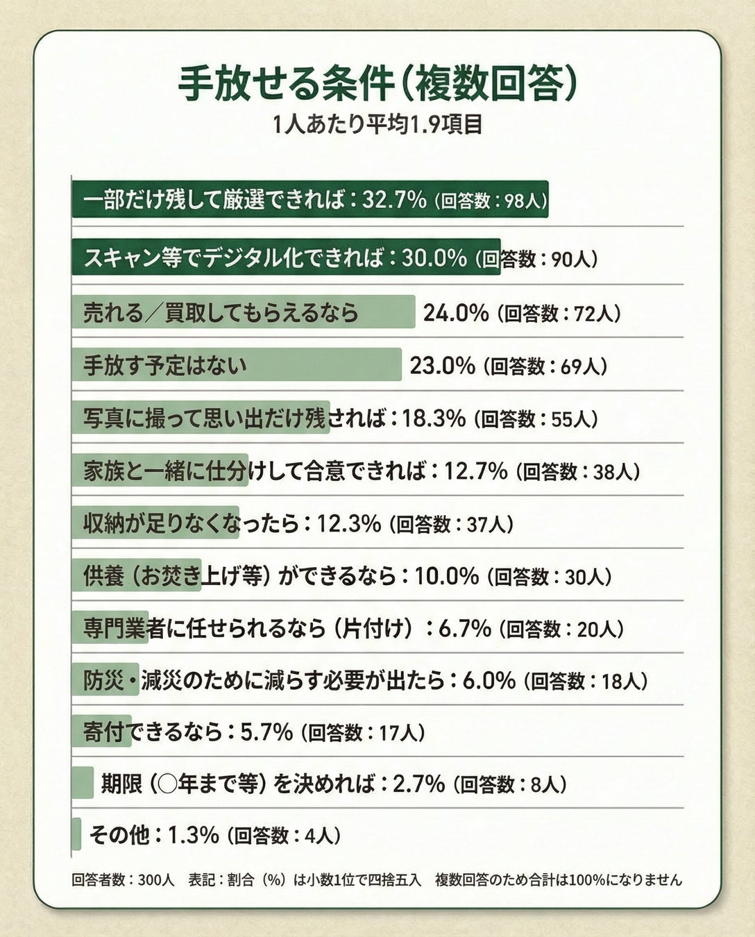 手放せるとしたら、どんな条件なら決断できそうかを聞いたところ、ゼロにするより残し方を変える選択が上位でした。(複数回答/1人あたり平均1.9項目を選択)