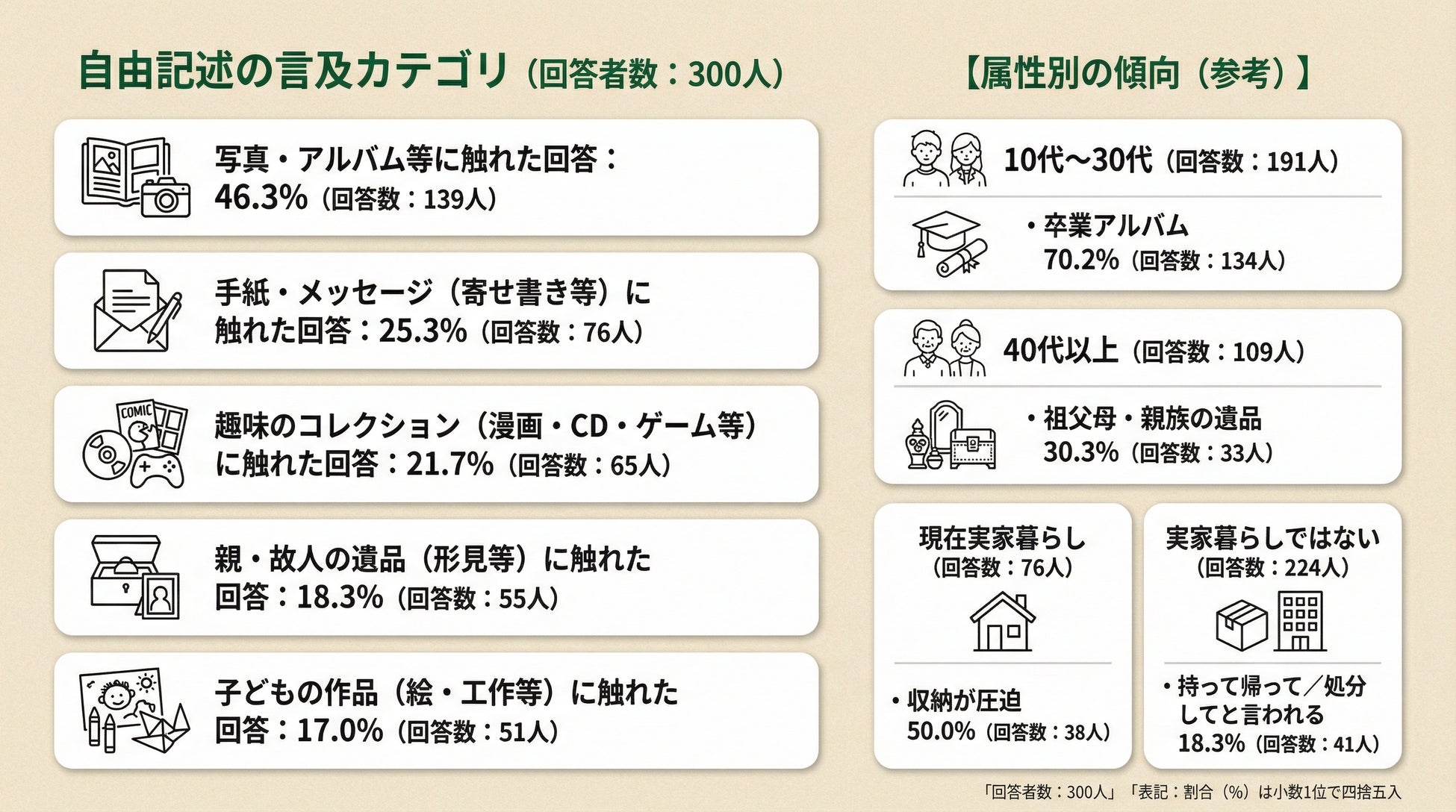 自由記述(300人分)を全体的に見ると、写真・アルバム、手紙、趣味のコレクション、親や故人の形見、子どもの作品などが多く語られていました。