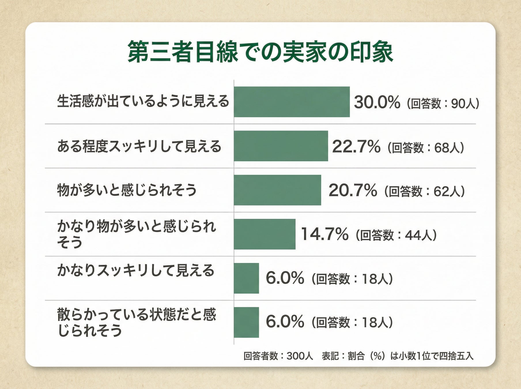 第三者が見たとき、実家の物の状態がどう見えると思うかを聞くと、生活感や物量への意識が分かれました。