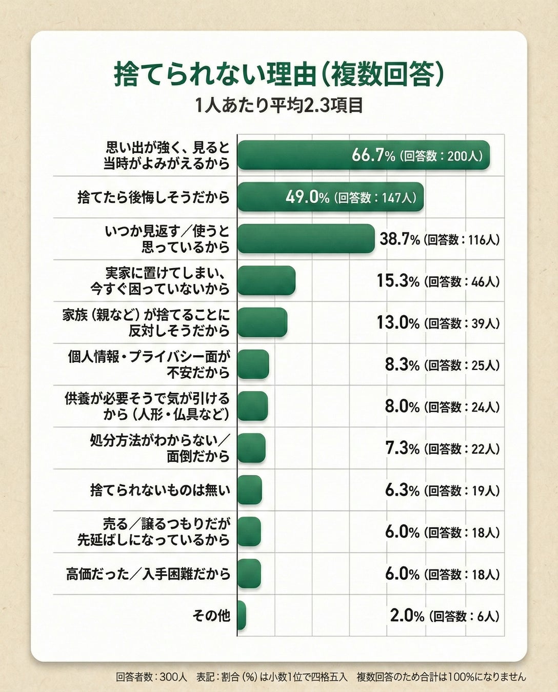 捨てられない理由を聞いたところ、上位は次の通りでした。(複数回答/1人あたり平均2.3項目を選択)