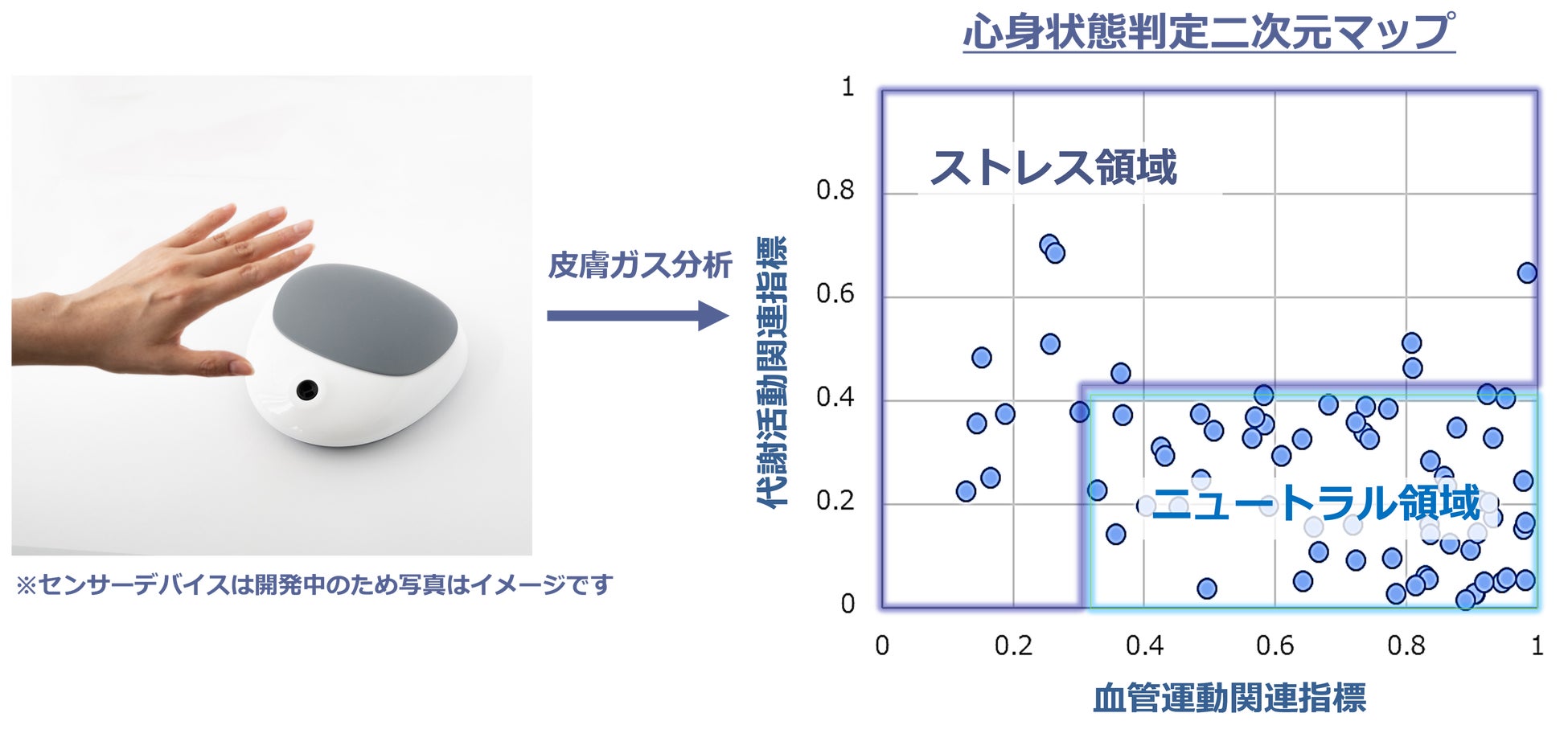 当社は、先端研究として東海大学関根教授と協業して進めていた皮膚ガス研究に着目し、心身状態判定二次元マップからストレスの蓄積予兆をとらえる生体センシング技術を開発しました。