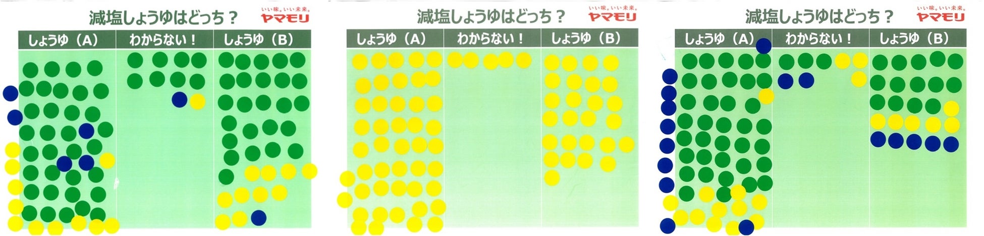 【方法】自社[特級濃口醤油=しょうゆ(A)]と、[おいしさそのまま 減塩しょうゆ=しょうゆ(B)]をそれぞれスプーンで舐め、塩分40%カットされていると思う方にシールを貼付