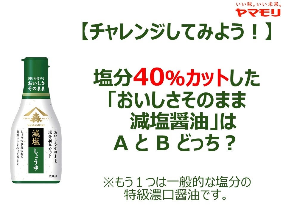 総合食品メーカー、ヤマモリ株式会社(本社:三重県桑名市、社長:三林 圭介)は11月23日(日・祝)にイオンモール津南1F つどいの広場で開催された「とこわか食と元気フェア(主催 三重県)」に出展し、自社商品「おいしさそのまま 減塩しょうゆ」を用いた「減塩しょうゆはどっち?」クイズを開催しましたのでその結果をご報告します。