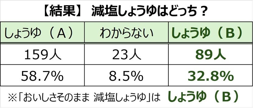 正解の[しょうゆ(B)]を「減塩」と答えた人は全体の32.8%。大半の方が減塩しょうゆと気付かずに「おいしさそのまま 減塩しょうゆ」を味わった結果となりました。