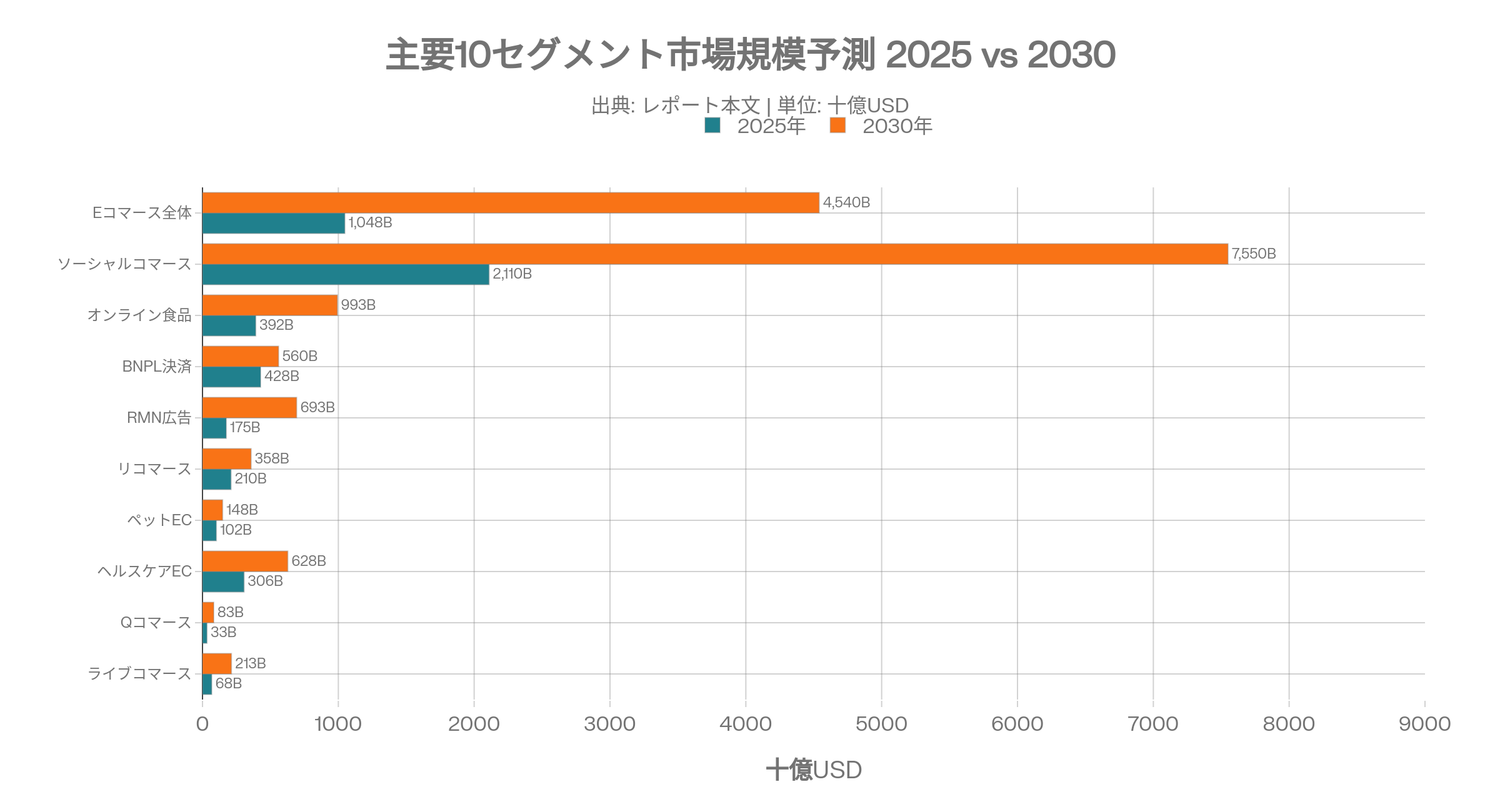 ソーシャルコマース/エージェンティックコマース/ライブコマース/コマースメディア/クイックコマース/リコマース/バーティカルECなど主要セグメントについて多元分析