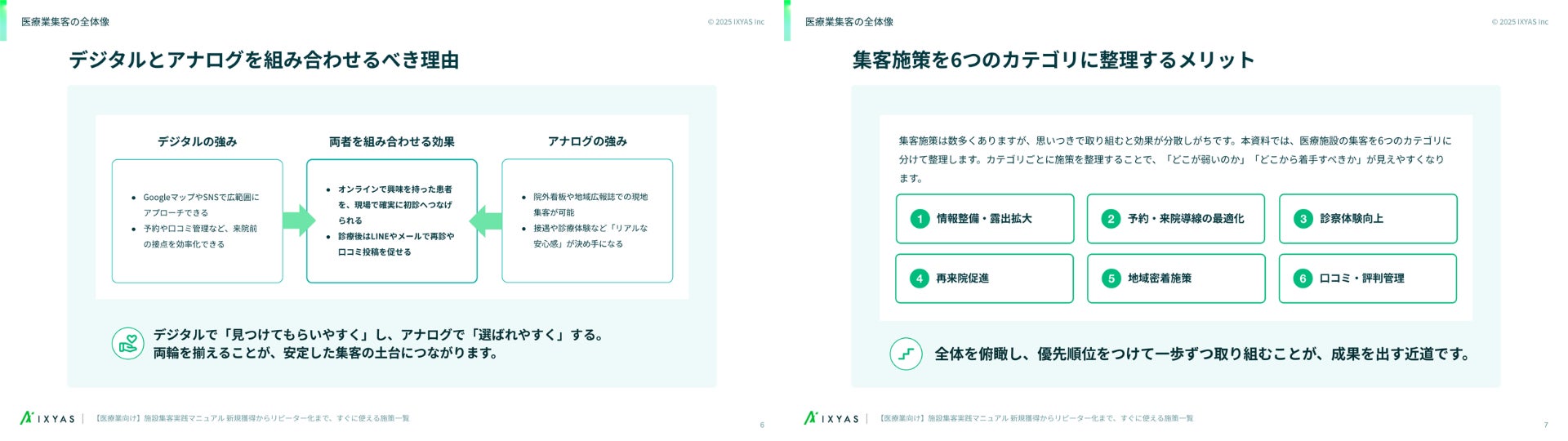本資料では、オンラインとオフラインを組み合わせた6つの集患施策カテゴリをもとに、効果的な取り組み事例を紹介しています。