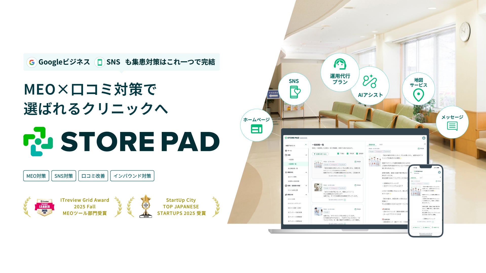 「STOREPAD」は、Googleマップ・SNS・公式サイトなどの複数媒体をまとめて管理・活用することで、クリニックや歯科医院の情報発信や口コミ対策を効率化し、集患・マーケティングをサポートするプラットフォームです。MEO対策をはじめとした、クリニック・歯科の集患に必要な最新のWEB集患対策をワンストップで代行します。