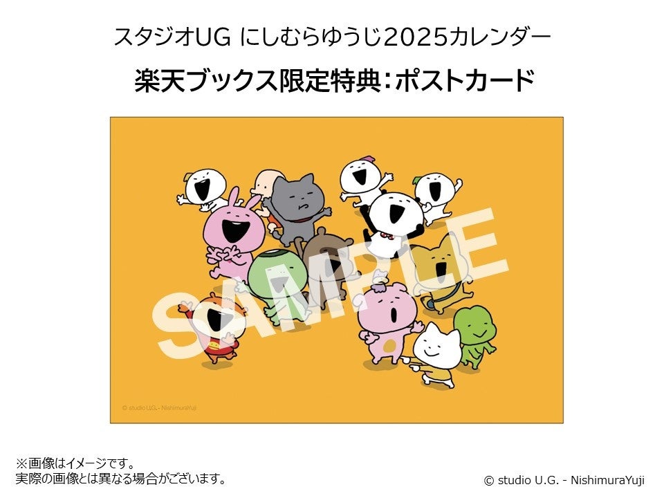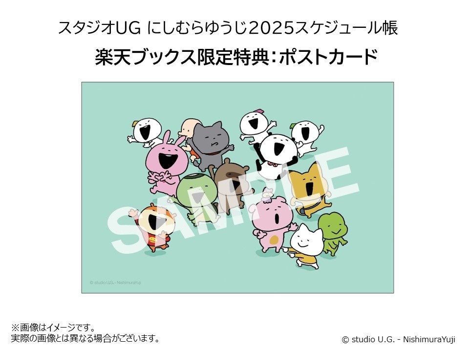 「卓上 スタジオUG にしむらゆうじ 2025カレンダー」「スタジオUG にしむらゆうじ 2025スケジュール帳」を、それぞれ楽天ブックスにてご予約・ご購入されたお客様に、ポストカードを1枚プレゼントいたします。(カレンダー、スケジュール帳でポストカードの柄は異なります。)ここでしか手に入らない限定特典です。ぜひご予約ください!