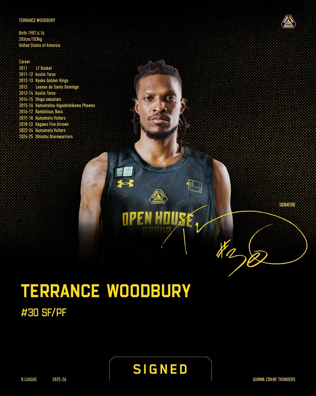 「このたび、群馬クレインサンダーズはテレンス・ウッドベリー選手との契約が合意に至りましたのでお知らせいたします。