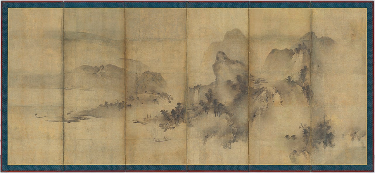 雪村の晩年を代表する貴重な作品で、六曲一双(ろくきょくいっそう)※の中央部に湖水の広がりを置き、左右に湖岸の山と建物を配する構図となっています。