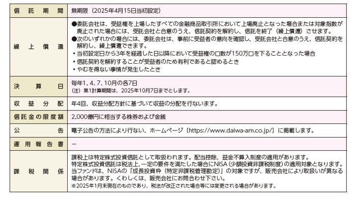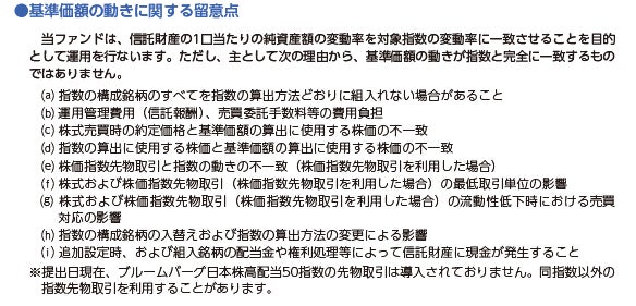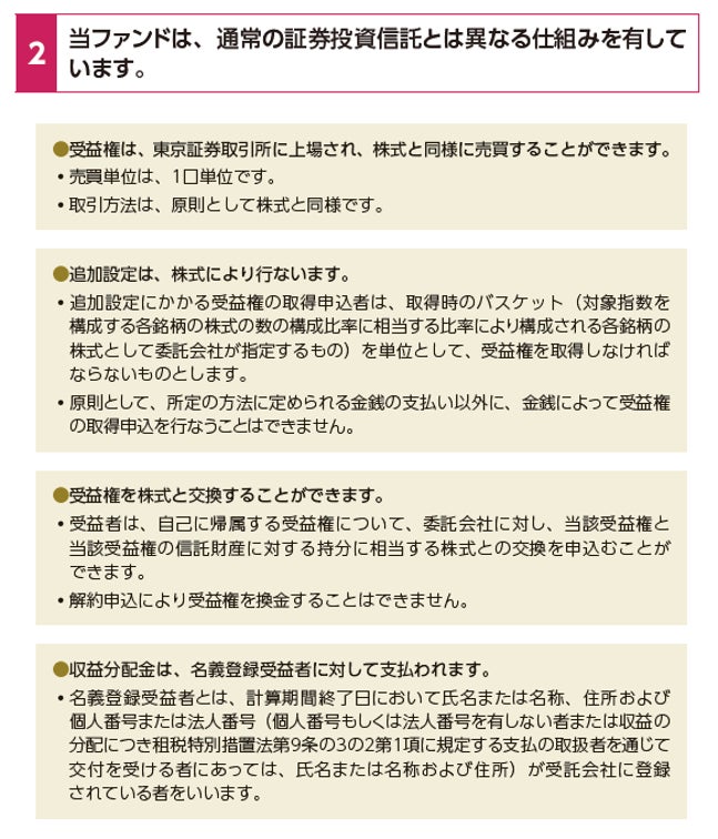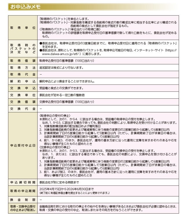株式または金銭の拠出により当ファンドの取得(応募、追加設定)をご希望の場合には投資信託説明書(交付目論見書)を販売会社(指定参加者)よりお渡しいたしますので、必ず内容をご確認ください。