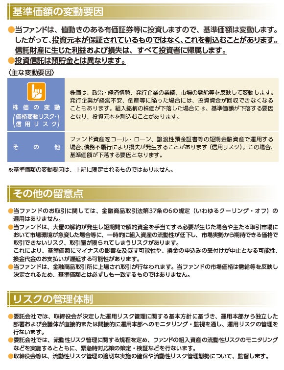 投資信託は値動きのある有価証券等に投資しますので、基準価額は大きく変動します。したがって、投資元本が保証されているものではありません。信託財産に生じた利益および損失はすべて投資者に帰属します。投資信託は預貯金とは異なります。