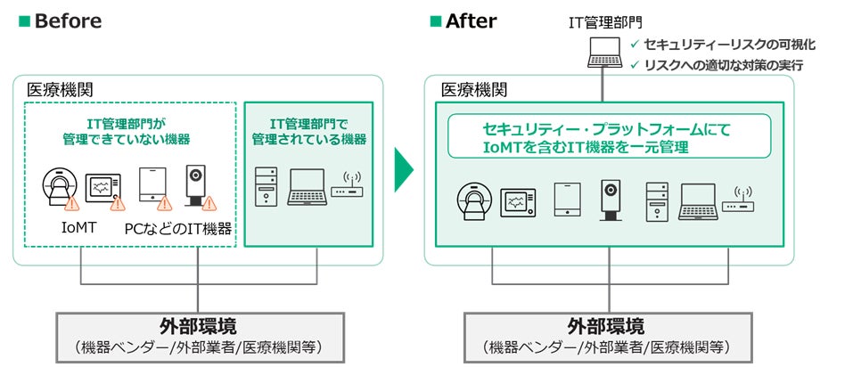 近年、IoMTの普及が急速に進む一方で、医療機関を標的としたサイバー攻撃が相次ぎ、診療システムが一時的に停止するなどの被害も報告されています。こうした状況を受け、厚生労働省は2023年に「医療情報システムの安全管理に関するガイドライン 第6.0版」を発出し、医療機関に対しセキュリティー対策の強化を求めています。しかしながら、多くの医療機関では、IT人材の不足や部門ごとの機器管理の分散により、IoMTを含むIT機器の一元管理が行き届いておらず、セキュリティー対策が不十分となっている課題を抱えています。