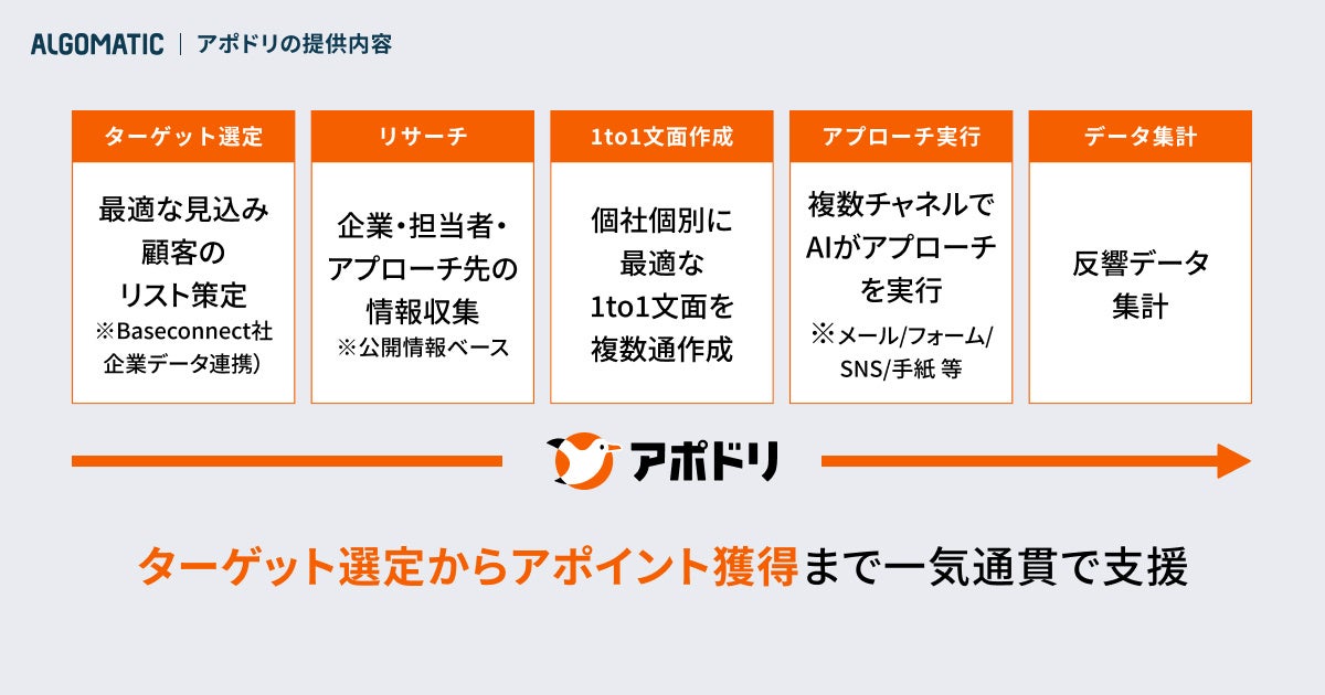 株式会社Algomatic(本社:東京都港区、代表取締役:大野峻典、以下Algomatic)が開発・提供す営業AIエージェント『アポドリ』は、2026年3月3日、オフラインチャネルでのアプローチプランを新たに追加したことをお知らせいたします。これにより、FAXおよび手紙を活用した1to1アプローチが可能となり、オンラインとオフラインを横断するラストワンマイルの営業ソリューションを実現し、マルチチャネル型営業プラットフォームへと進化します。