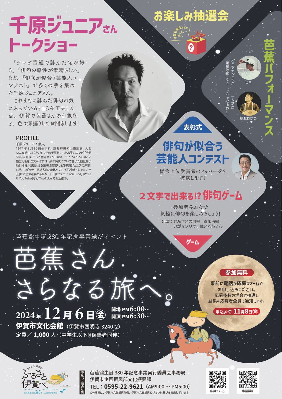「俳句が似合う芸能人コンテスト」で多くの票を集めた千原ジュニアさんをゲストにお迎えし、これまでに詠んだ俳句について、また、伊賀や芭蕉さんの印象などをお聞きします。そのほか、俳句ゲーム、芭蕉パフォーマンス、名産品が当たる抽選会など、楽しい企画が盛りだくさんですので、ぜひお越しください。
