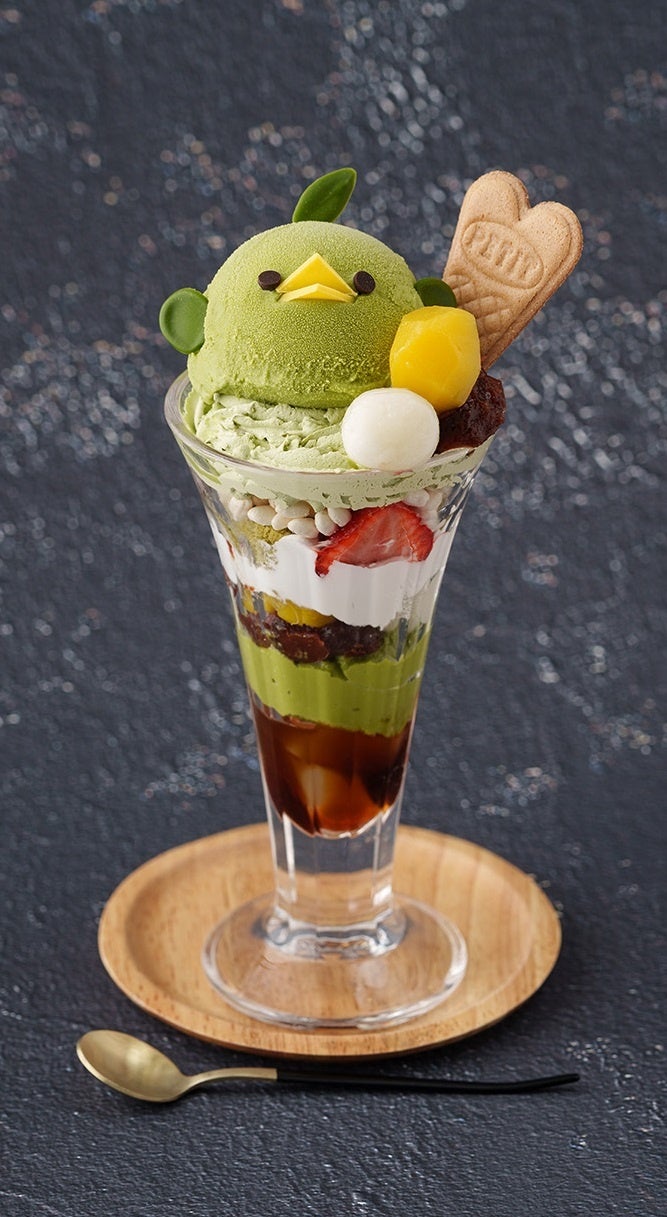 濃厚な抹茶アイスで表現したぴよりんをメインに、ムース、カステラ、ホイップクリームは全て抹茶味。そこに、深みのある黒蜜、瑞々しい寒天、もちもち白玉、栗の甘露煮を重ね、和テイストのパフェに仕上げました。