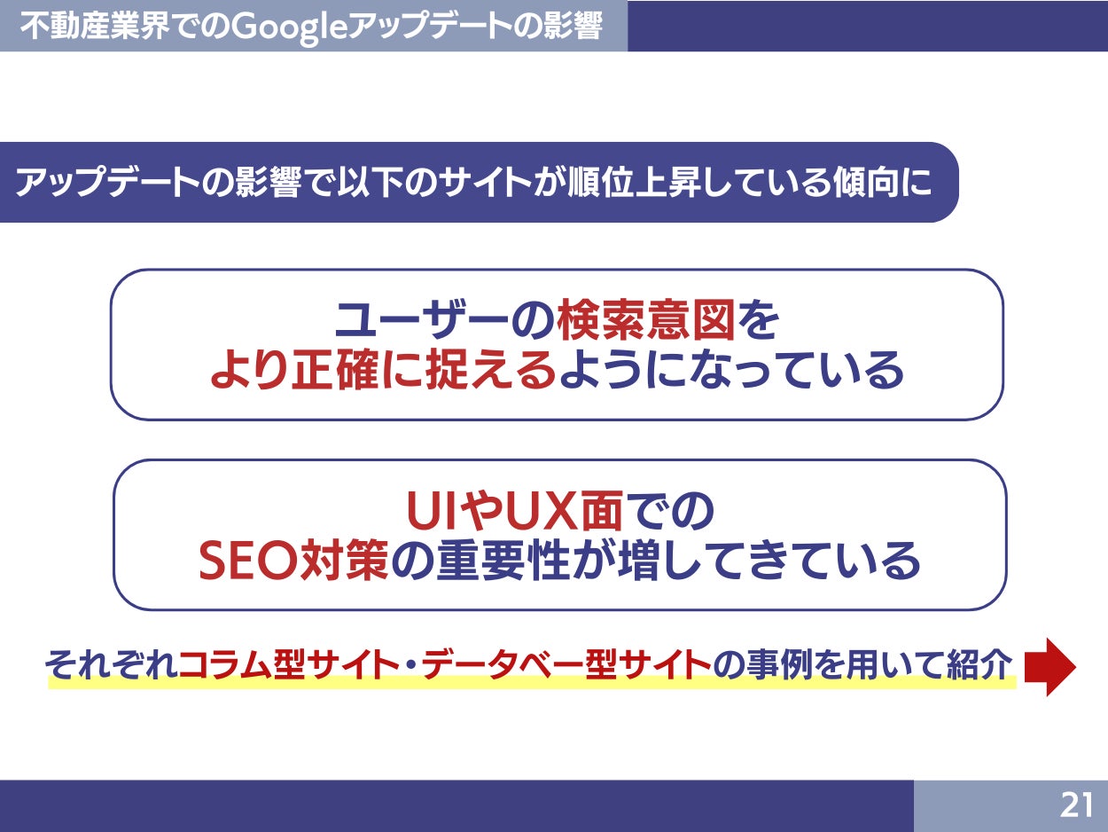 「不動産業界でのGoogleアップデートの影響」では、具体的な事例をもとにアップデートの影響を詳細に解説しています。アップデートの特徴や不動産業界でのGoogleアップデートの対策などのSEO情報にも注目です。