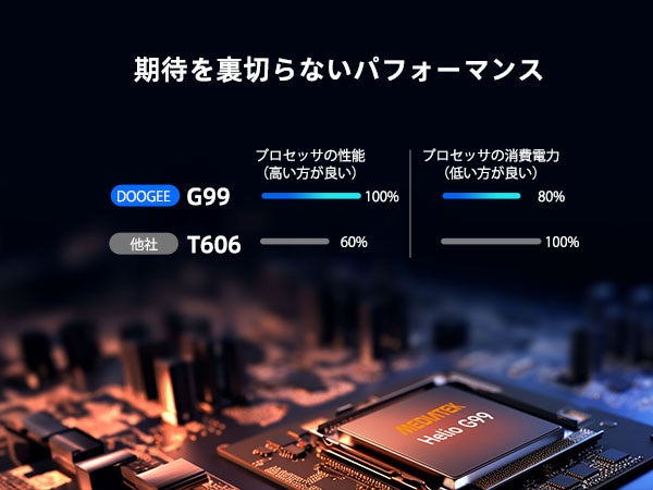 先進プロセス6nm技術を採用したHelio G99プロセッサーを搭載し、最大2.2GHzのCortex-A76コアを2基、最大2GHzのCortex A-55コアを6基搭載しています。 パワフルな処理能力により、複雑なコンピューティング・タスクやグラフィックス・レンダリングを容易に処理し、スムーズなマルチタスクとゲーム体験を提供します。