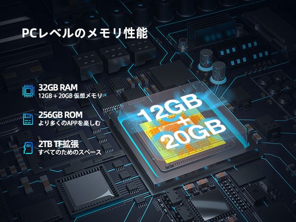 32GB(12GB +20GBの仮想メモリ)のメモリは高速な応答速度を提供し、12GBの物理メモリに加えて、20GBの仮想メモリが搭載されているため、シームレスなマルチタスキングが可能です。メモリ不足による動作の遅さやフリーズといった問題を心配する必要はありません。