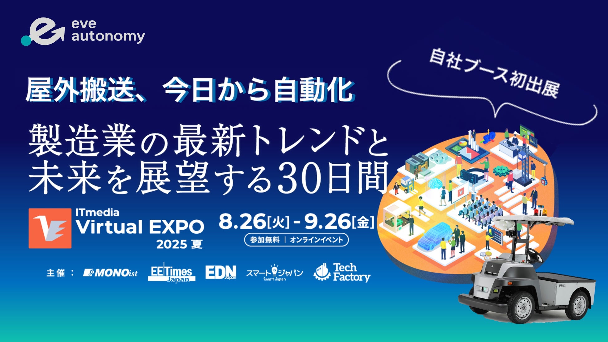 株式会社eve autonomy(イヴ・オートノミー、静岡県磐田市、代表取締役CEO:星野 亮介、以下「eve autonomy」)は、アイティメディア株式会社が主催する国内最大級のオンライン展示会「ITmedia Virtual EXPO 2025 夏」に出展いたします。