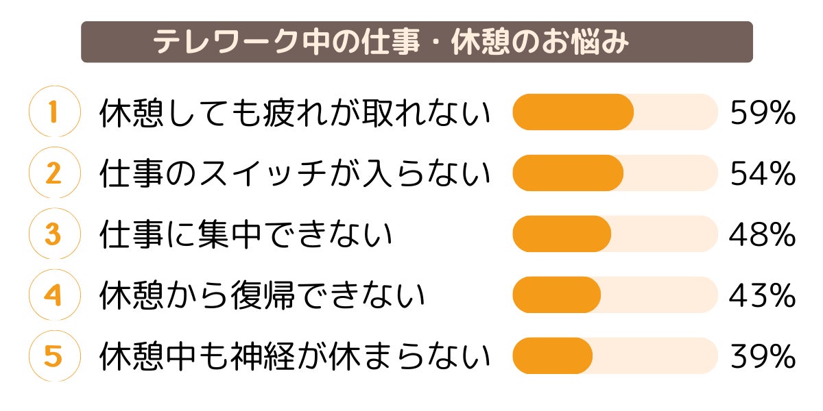 昨今、多様化する働き方の中で、テレワーク、出社、ハイブリッド型など、様々な働き方に自分をフィットさせることが求められるようになりました。テレワーク中は、「休憩をうっかり忘れてしまう」「ついだらだら休憩を取ってしまう」など気持ちのリズムが乱れがちです。事前の調査により「休憩しても疲れが取れない」「仕事のスイッチが入らない」「仕事に集中できない」など、テレワーク中の仕事や休憩について悩んでいる方が半数以上いることがわかりました※1。