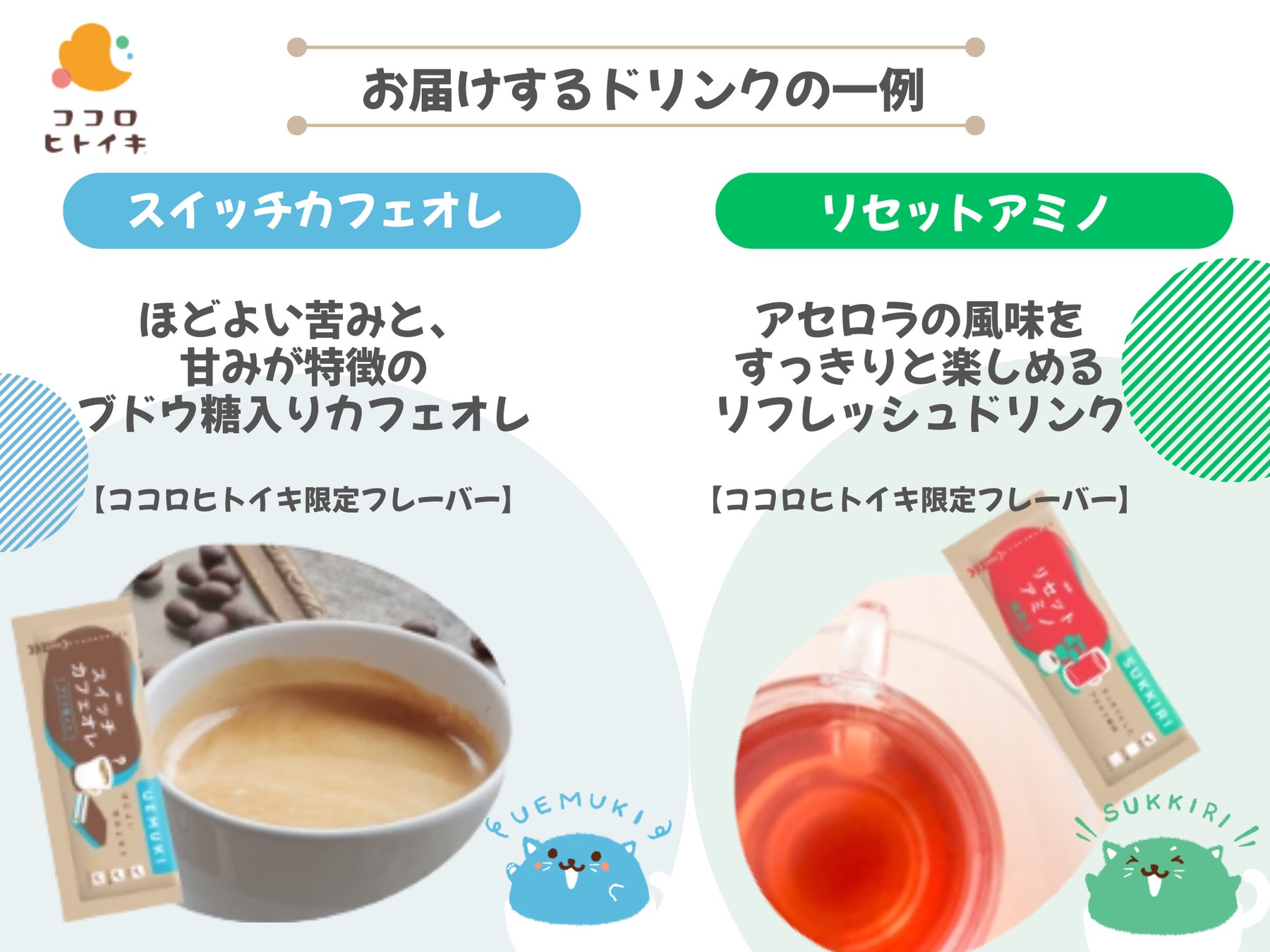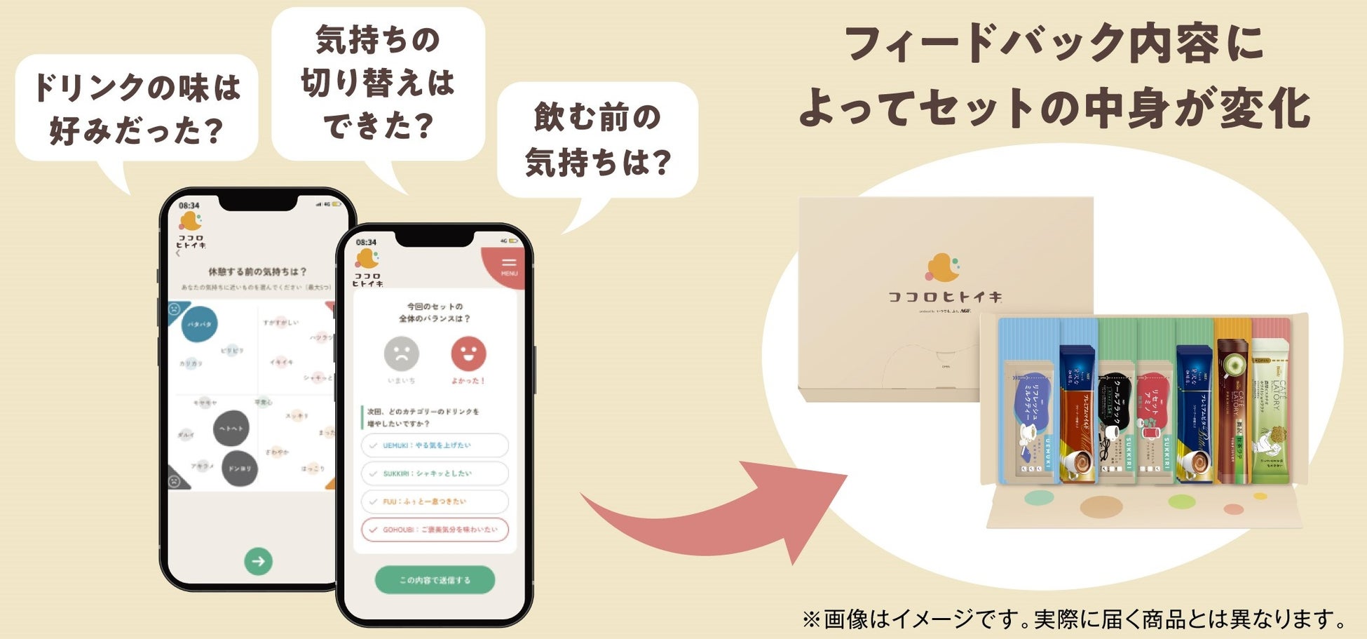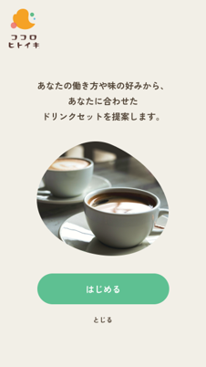 「ココロヒトイキ®」は、ユーザーのなりたい気持ちでドリンクを選ぶという新しい嗜好体験を通じて、仕事と休憩、気持ちのリズムを整えるドリンクセットの定期便サービスです。30種類以上のドリンクを、仕事中切り替えたい気持ちに合わせた4つのカテゴリーに分類しました。