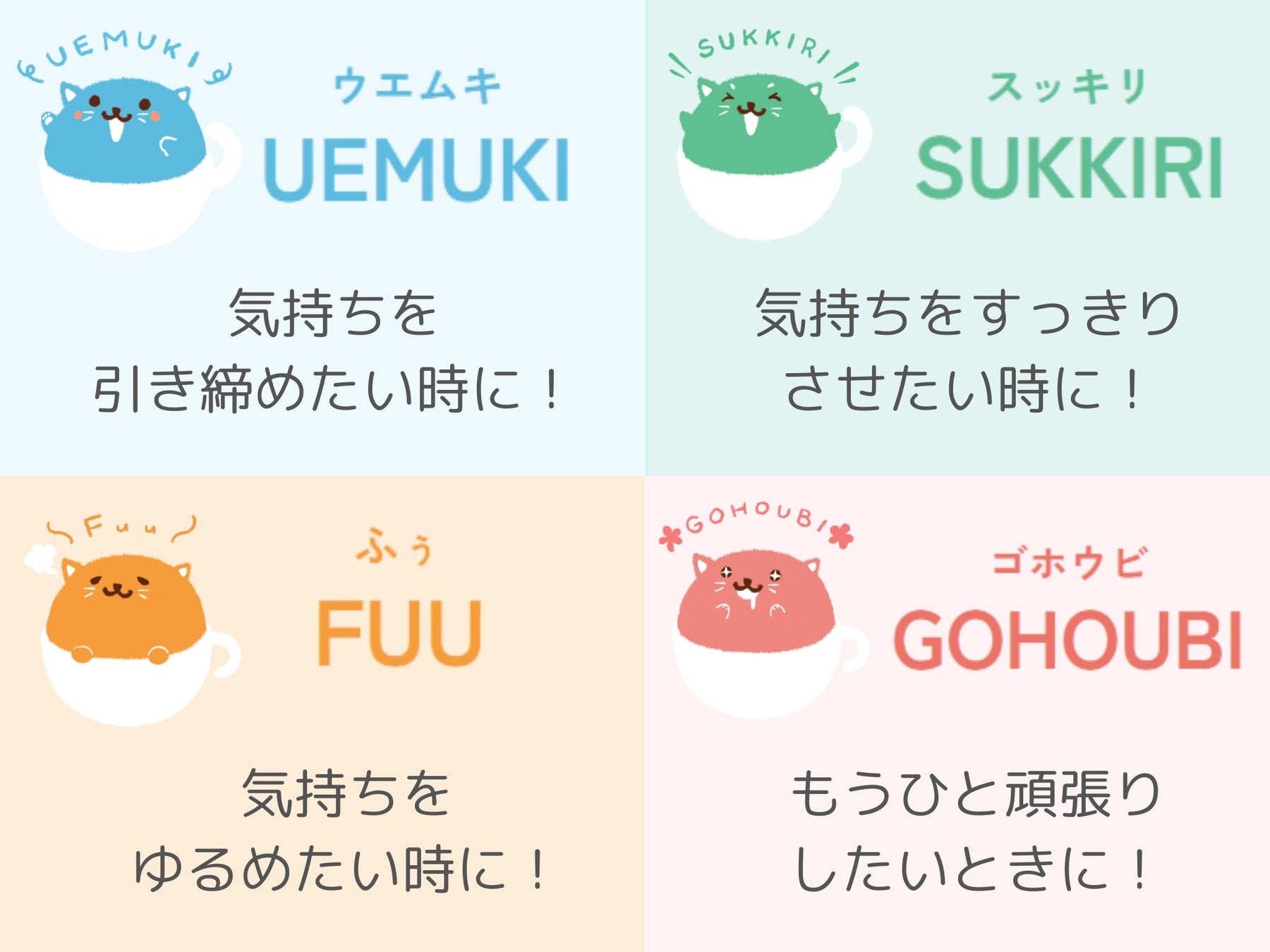 気持ちを引き締めたい時の「UEMUKI」、気持ちをスッキリさせたい時の「SUKKIRI」、気持ちをゆるめたい時の「FUU」、もうひと頑張りしたい時の「GOHOUBI」といったようにそれぞれのカテゴリーから、働き方アンケートに答えていただくことで、ユーザーの働き方に合ったドリンクをカスタマイズしてお届けします。