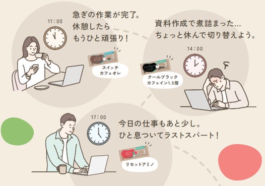 LINEと連携いただくと、休憩をとりたいタイミングに通知が届き、休憩のタイミングをサポートします。また、お届けする7種類21本から「なりたい気持ち」に合わせてドリンクを選んでいただき“休憩時間の気持ちの切り替え”をサポートします。